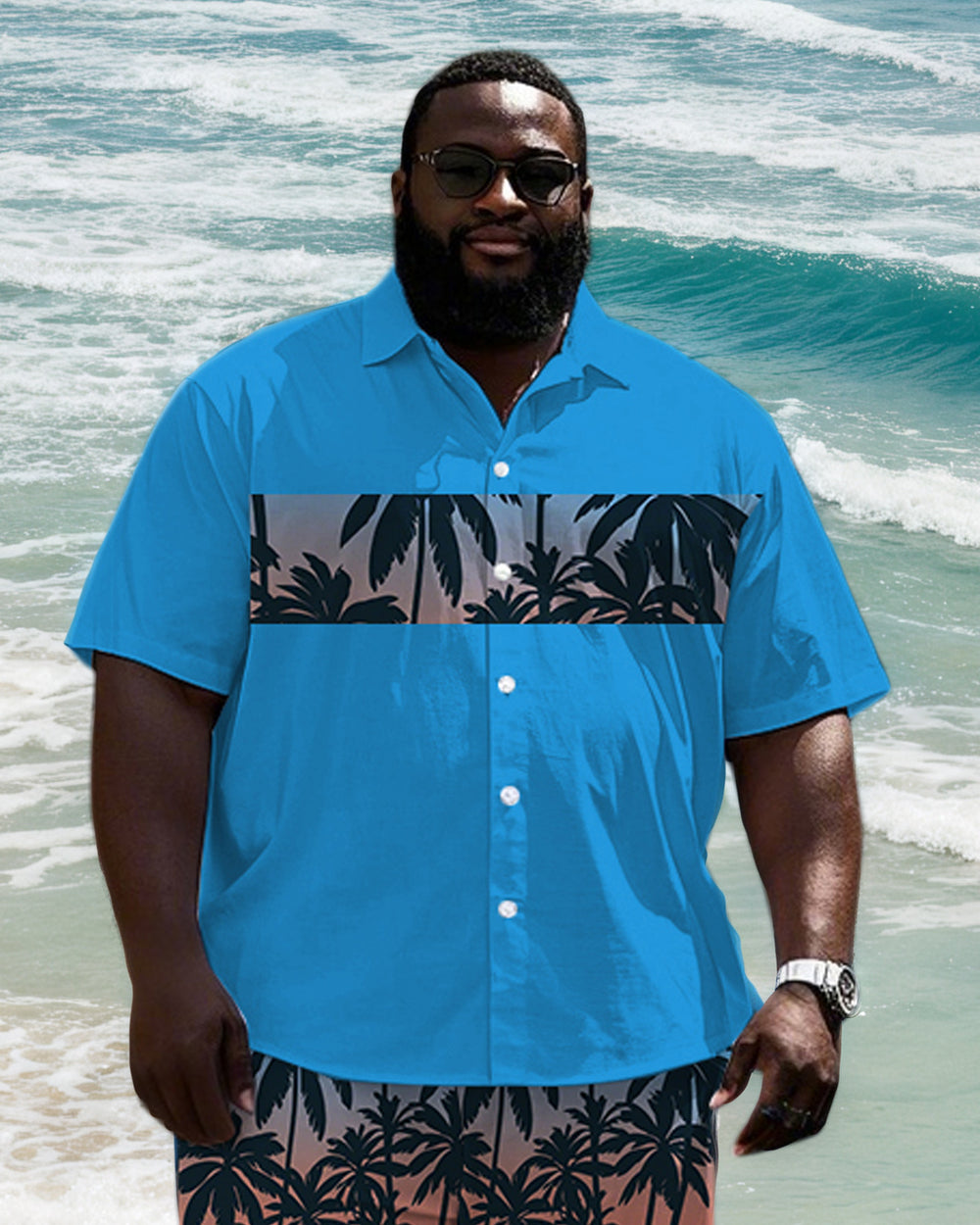 Big Men's Hawaiian Gradient Fashion Color Block Coconut Tree Printed Short Sleeve Shirt Shorts Set