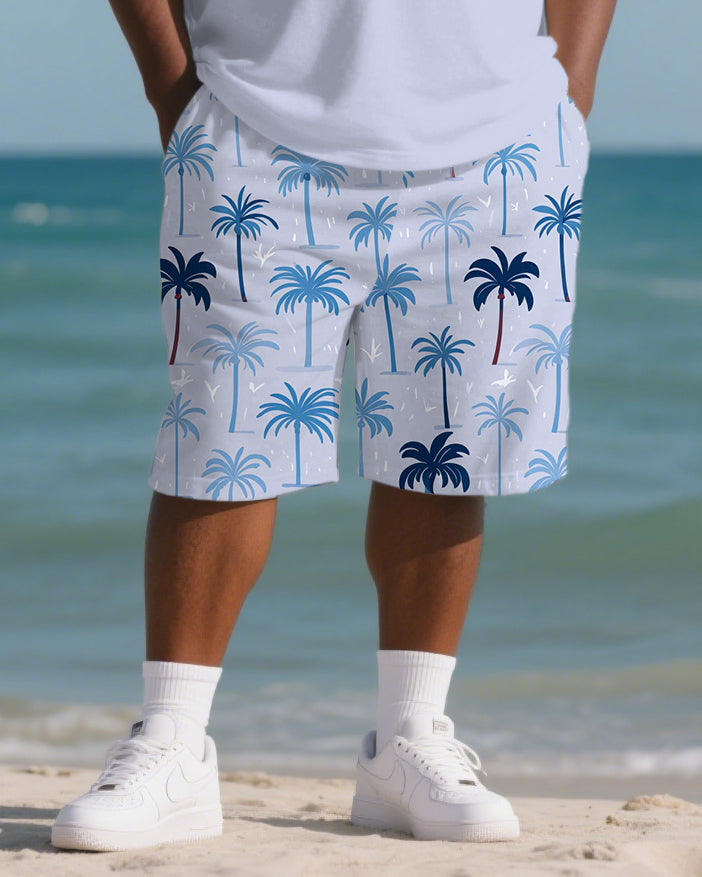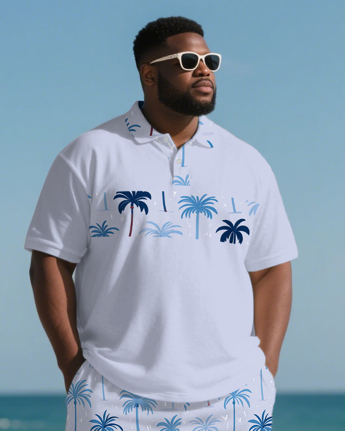Big Men's Hawaiian Theme Coconut Trees Stripe Style Short Sleeve Polo Shirt Shorts Suit