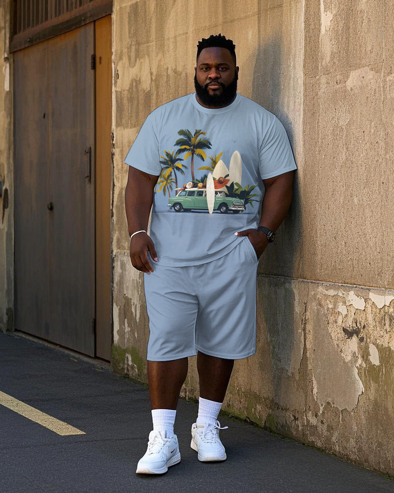 Big Men's Hawaiians Cartoon Coconut Tree and Car Printed Short Sleeve T-shirt Shorts Set