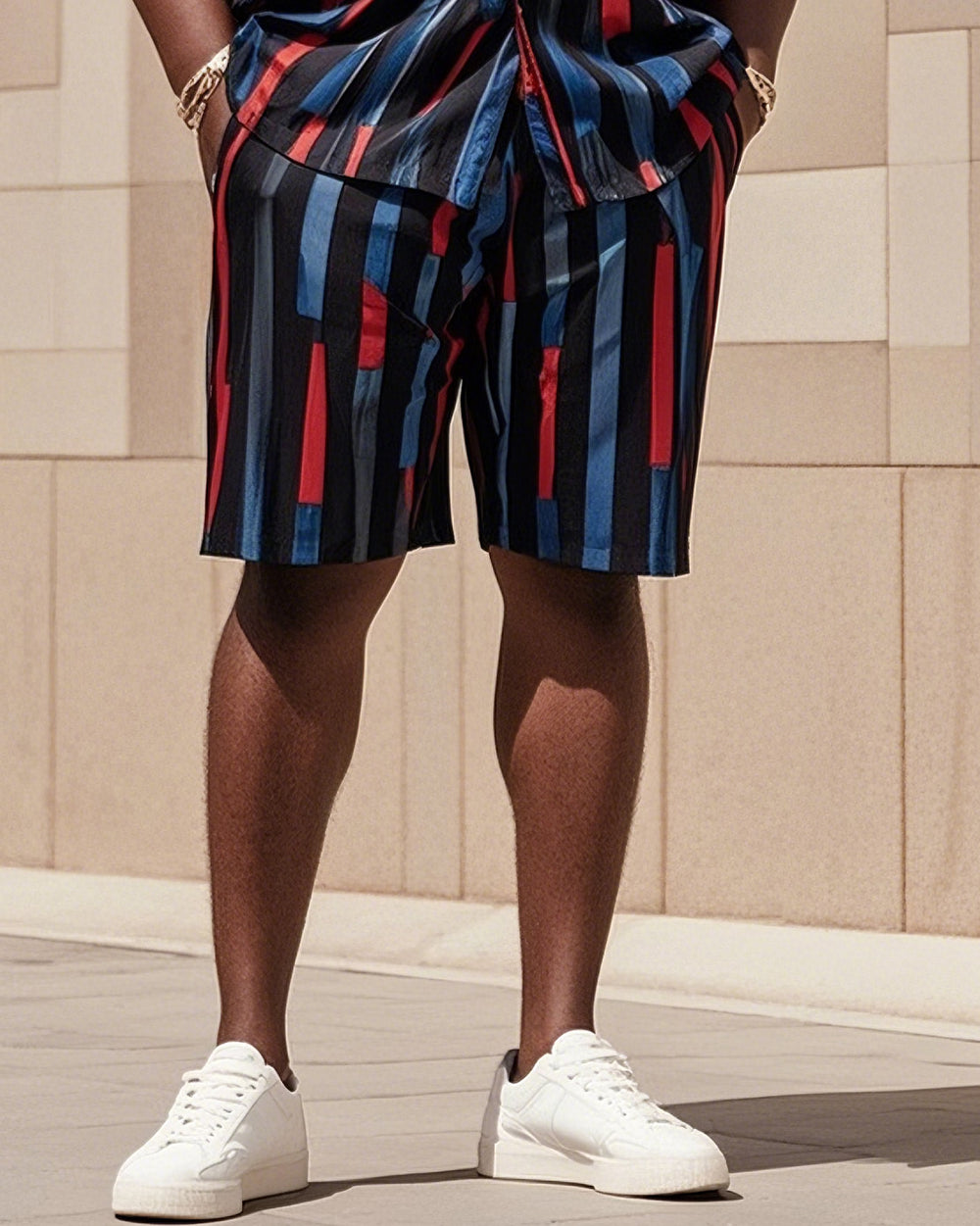 Big Men's-Hot Blue Red Black Striped Color Block Printed Short Sleeve Shirt Shorts Suit