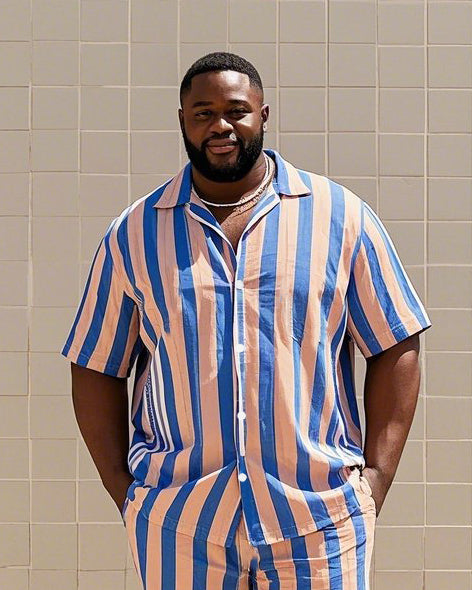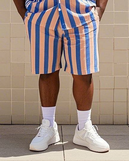 Big Men's-Hot Pink Blue Striped Color Block Printed Short Sleeve Shirt Shorts Suit
