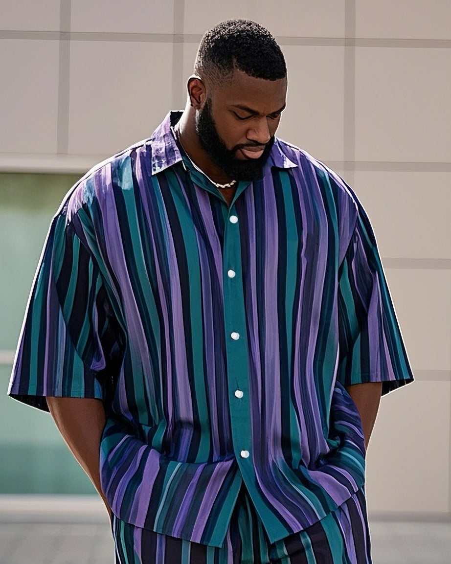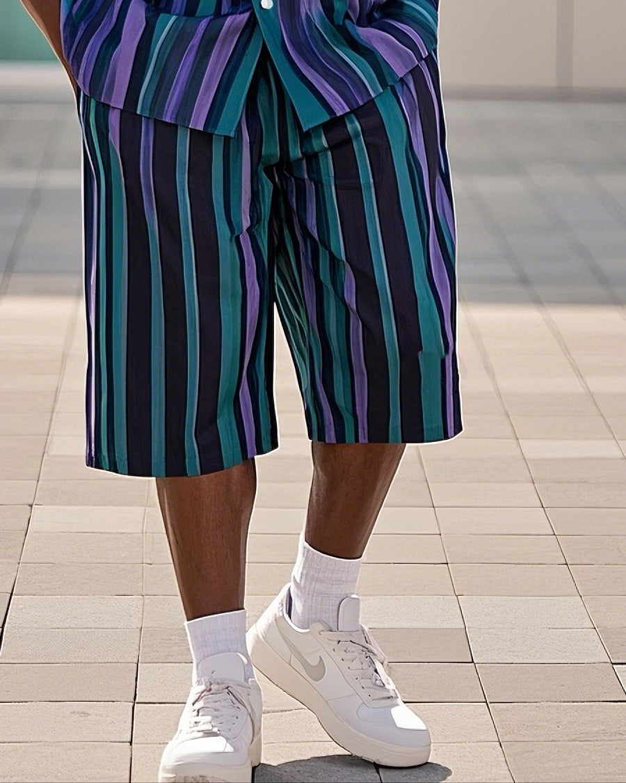 Big Men's Green Purple Striped Color Block Printed Short Sleeve Shirt Shorts Suit