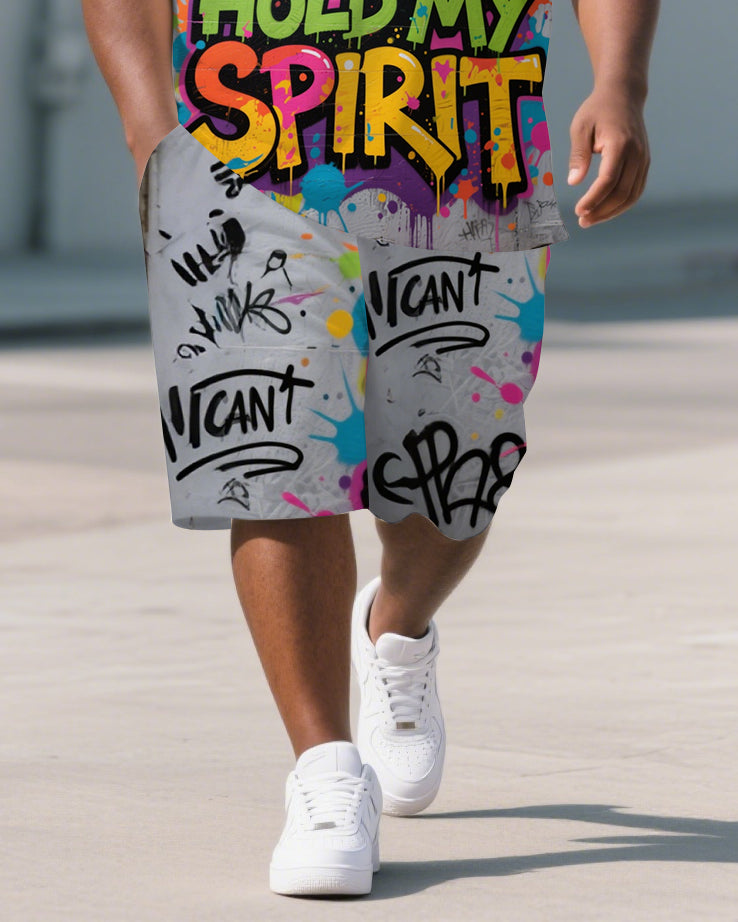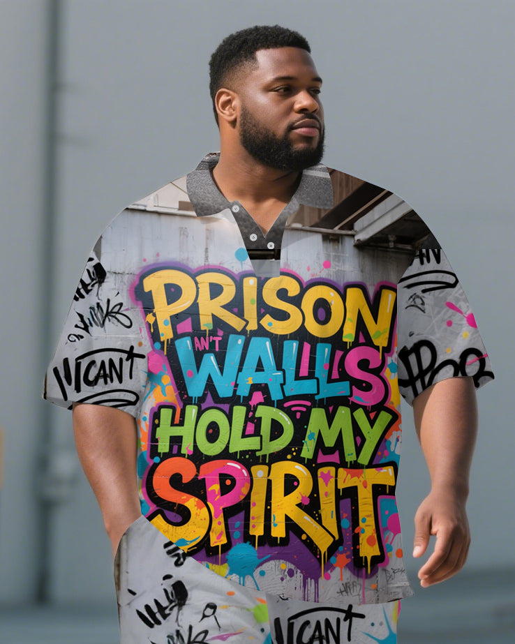 Big Men's PRISON WALL Colorful Lettering Streetwear Short Sleeve Polo Shirt Shorts 2-Piece Set