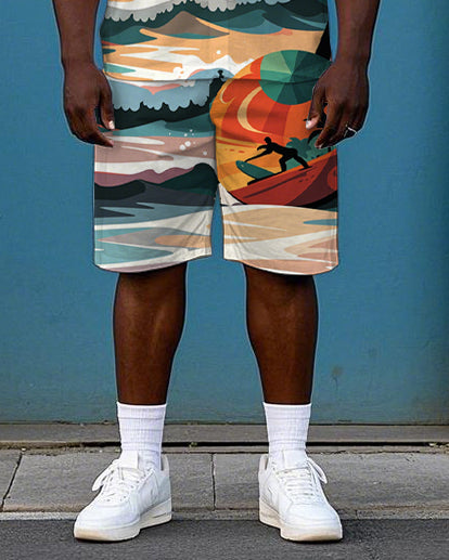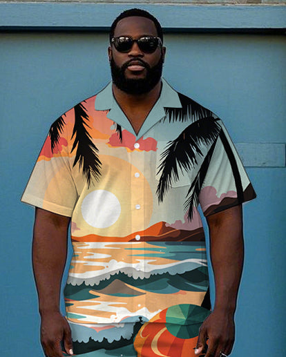 Big Men's Romantic Hawaiian Seaside Scenery Printed Cuban Collar Short Sleeve Shirt Shorts Set