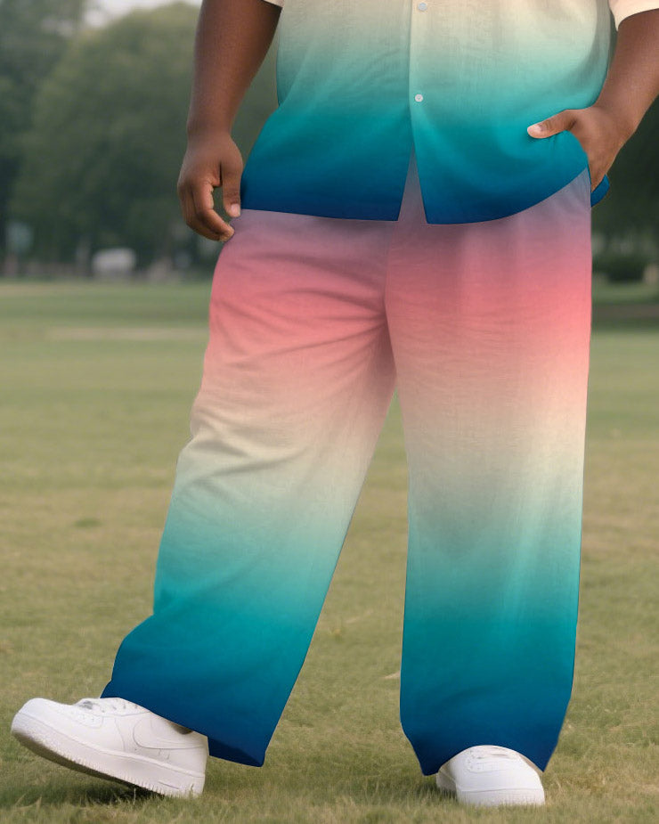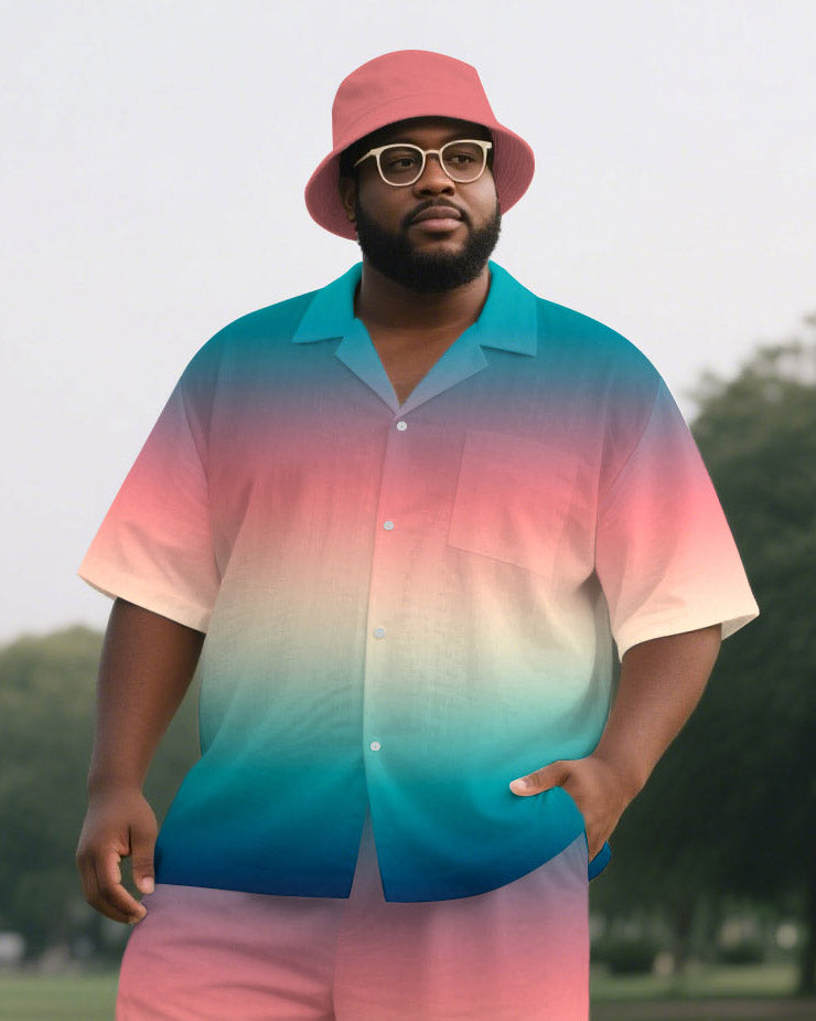 Big Men's Romantic Pink Gradient Style Button-up Short-Sleeve Shirt Pants 2-piece Sets