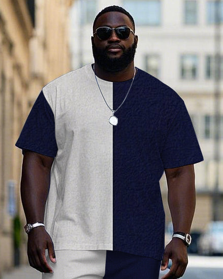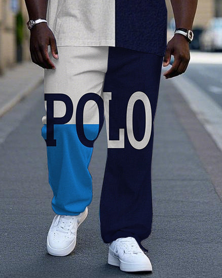 Big Men's Simple Casual Splicing Color Block Blue Letter POLO Printed Short Sleeve T-shirt Pants Set