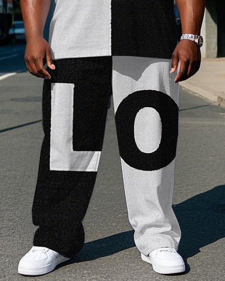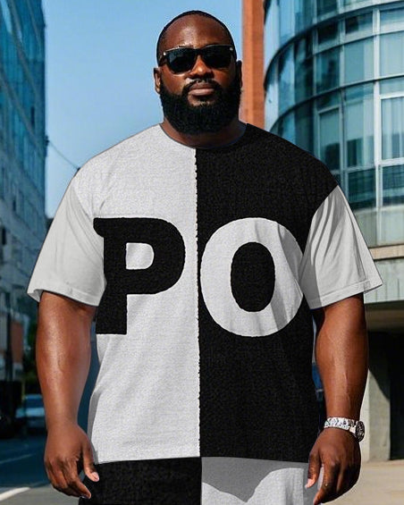 Big Men's Simple Fashion Black & White Splicing Letter POLO Printed Short Sleeve T-shirt Pants Set