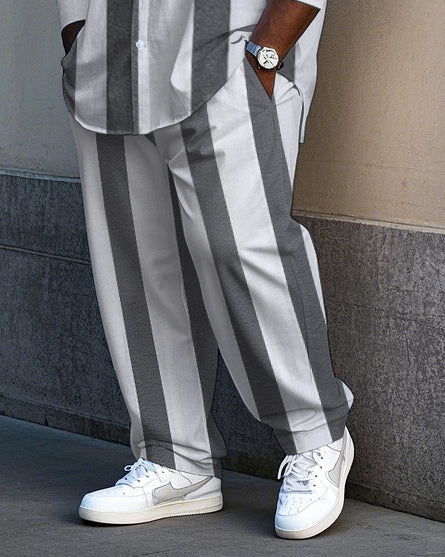 Big Men's Simple Fashion Vertical Stripe & POLO Letter Printed Long Sleeve Shirt Pants Set