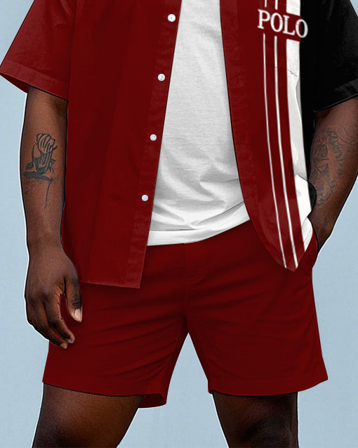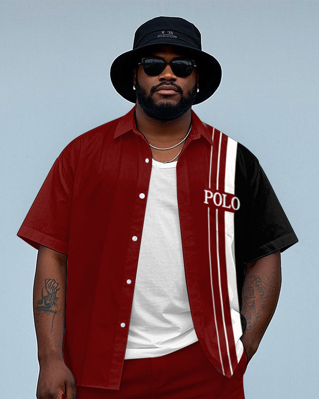 Big Men's Simple POLO Letter & Splicing Color Block Printed Short Sleeve Shirt Shorts Set