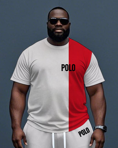 Big Men's Simple Red and White Color Block POLO Printed Short Sleeve T-shirt Drawstring Pants Set