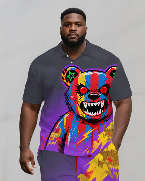Big Men's Simple Stripe Bear Printed Streetwear Short-Sleeve Polo Shirt Shorts Set