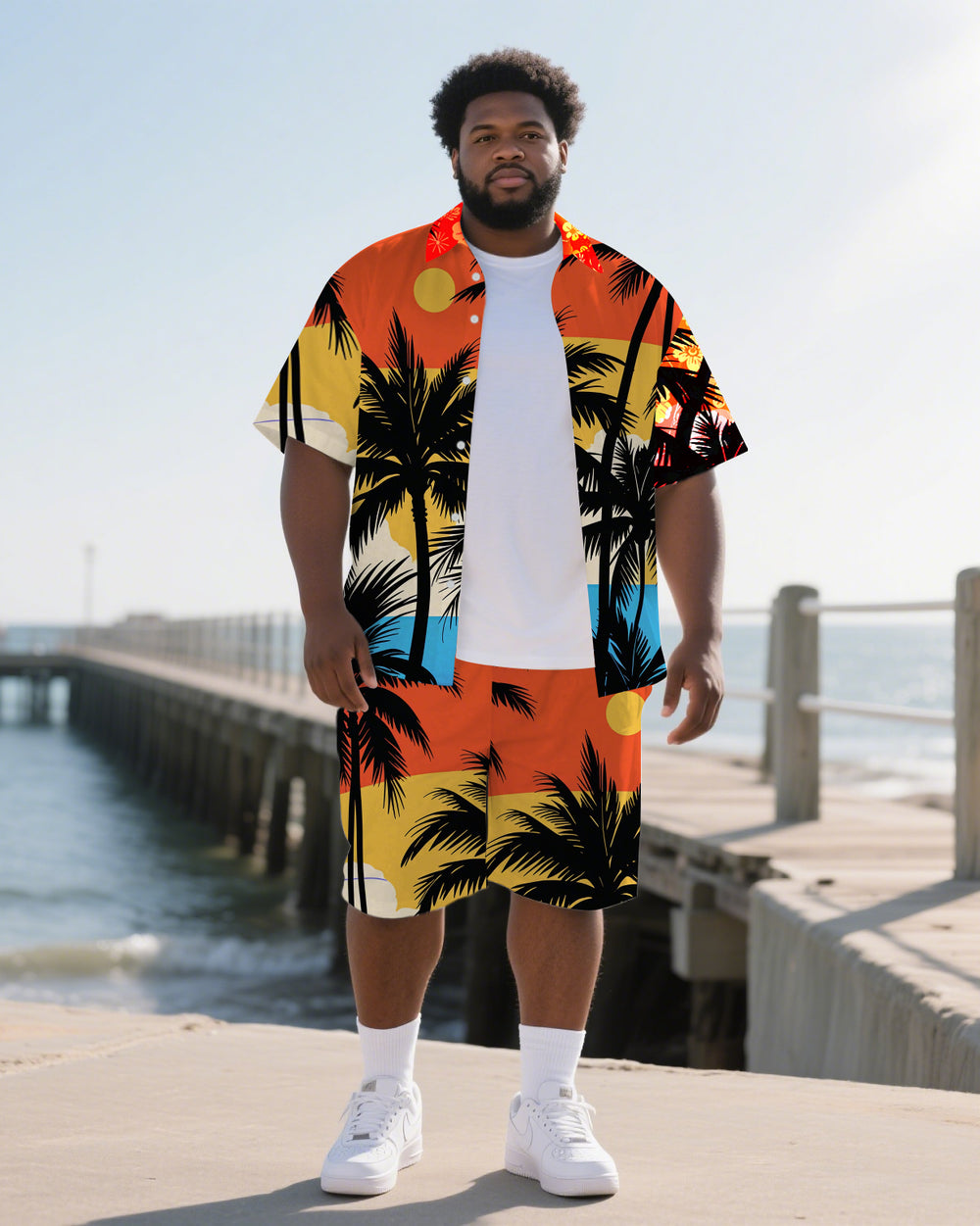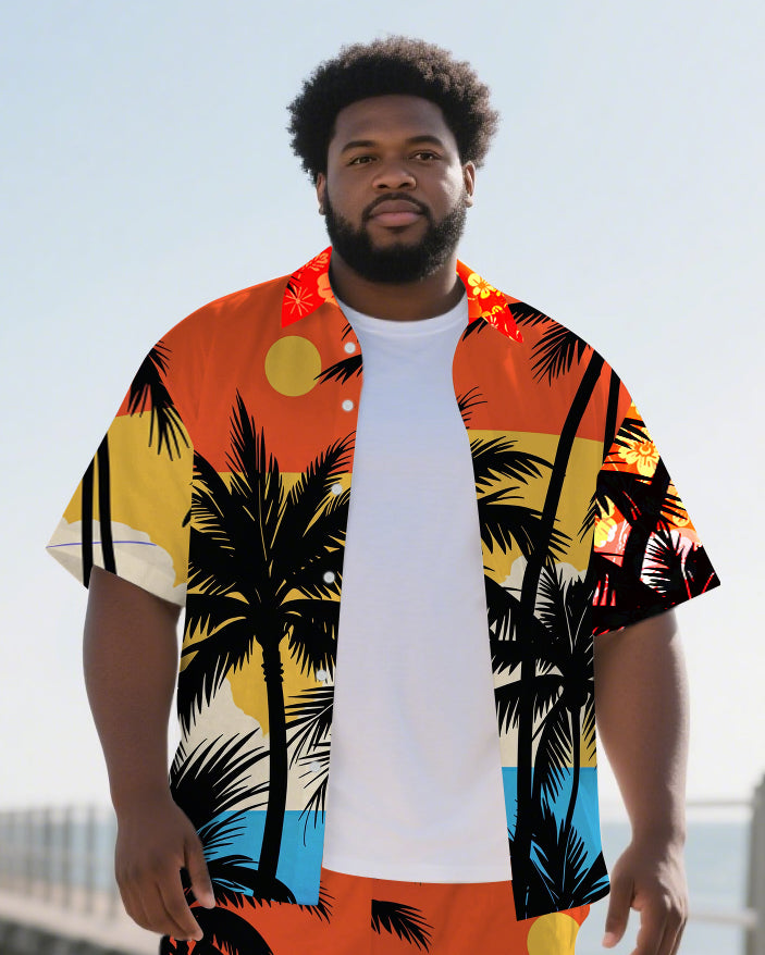 Big Men's Sunset Coconut Trees Hawaiian Theme 2-Piece Short Sleeve Shirt Shorts Suits