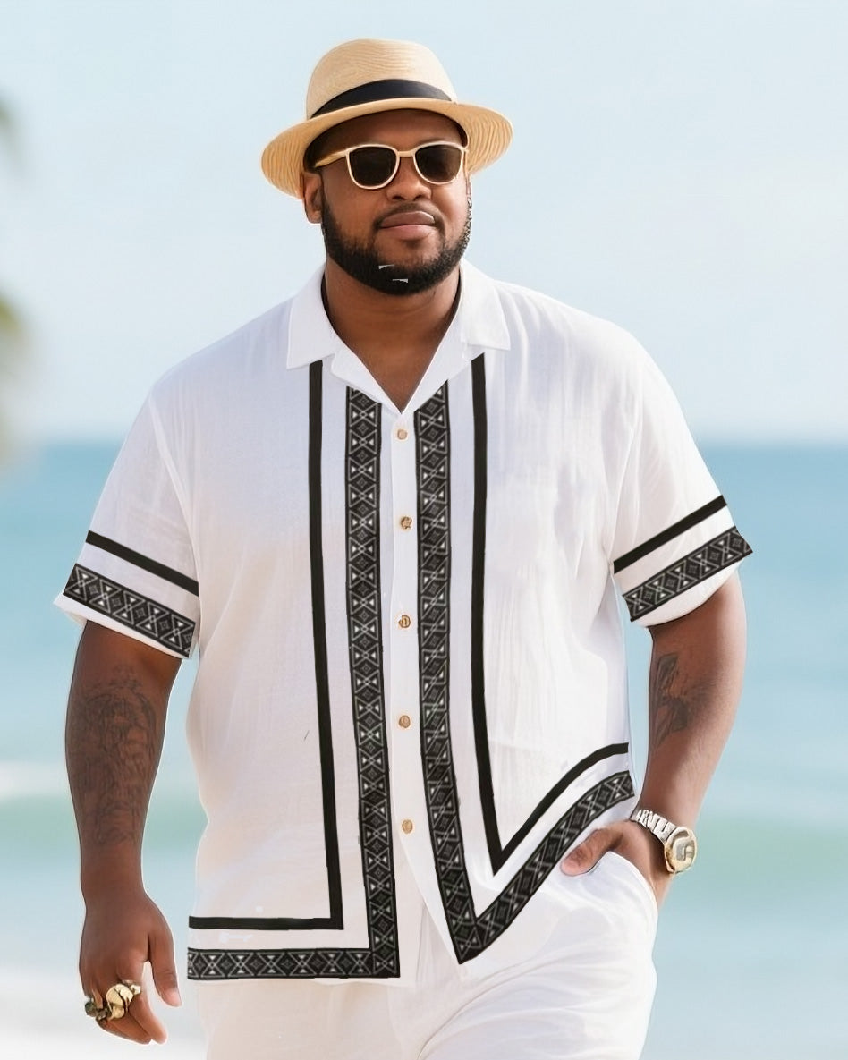 Big Men's Vacation Casual Bohemian Style Black Double Striped Edge Textured White Short Sleeve Shirt Shorts Suit