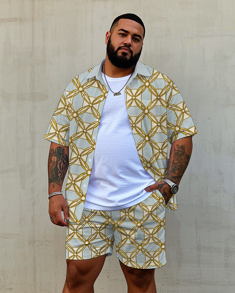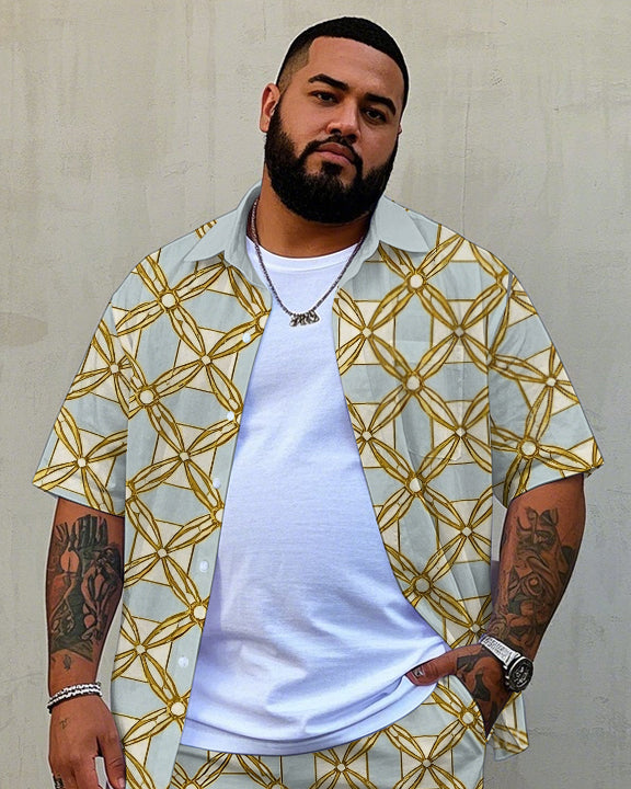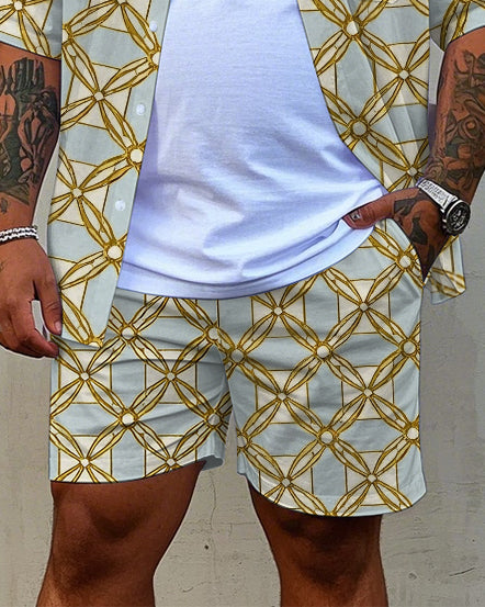 Big Men's Vintage Golden Geometric Regular Printed Pocket Casual Short Sleeve Shirt and Shorts Set