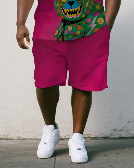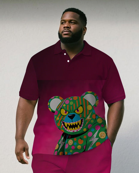 Big & Tall Man's Gradient Cunning Cartoon Bear Printed Short-Sleeve Polo Shirt & Shorts Set