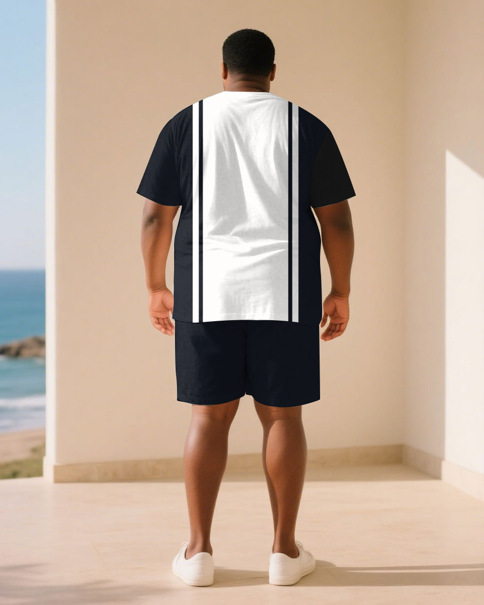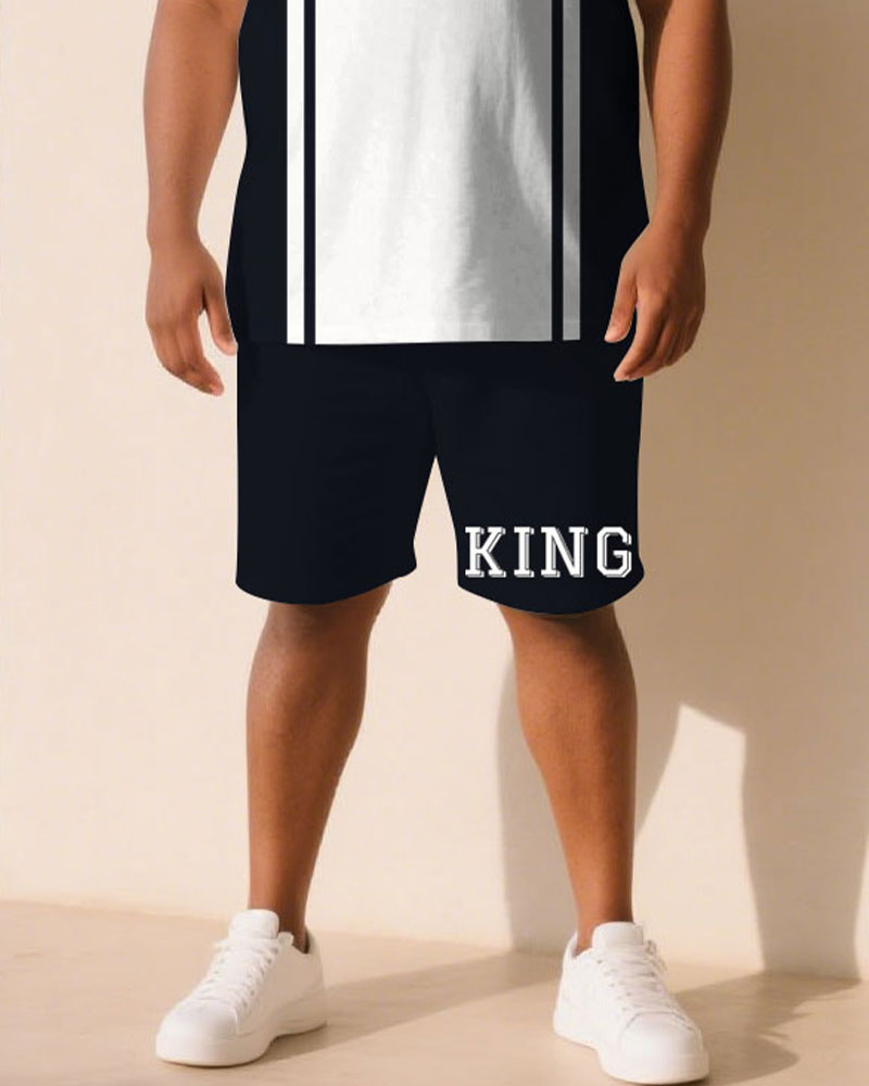 Big & Tall Men Dark Blue & White Chest King Slogan Print Round Neck Short Sleeve T-Shirt Shorts Suit