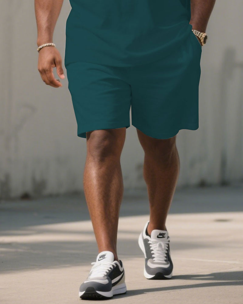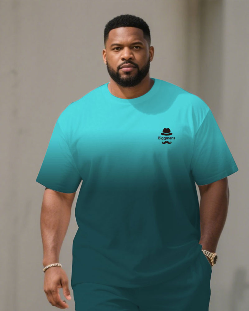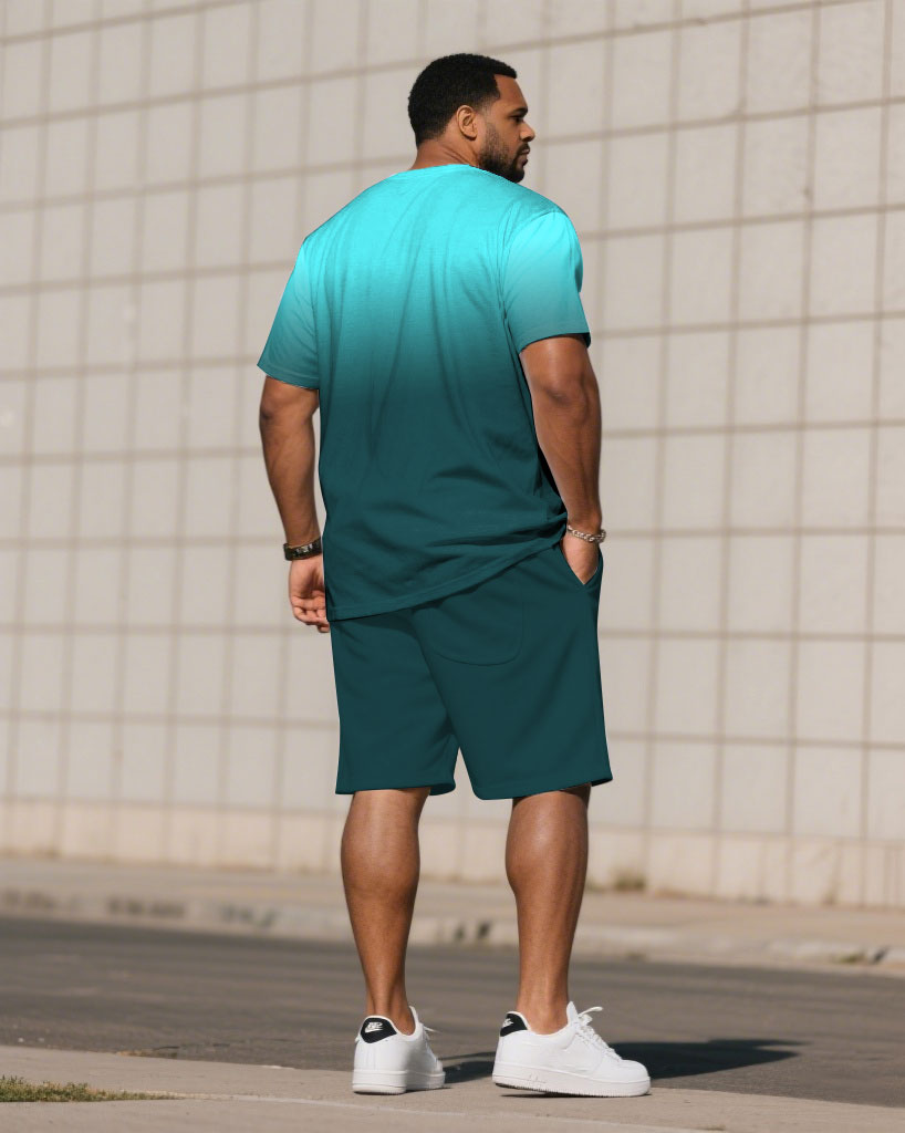 Big & Tall Men Dark Green & Fluorescent Blue Gradient Contrast Crewneck Short Sleeve T-shirt Shorts Suit
