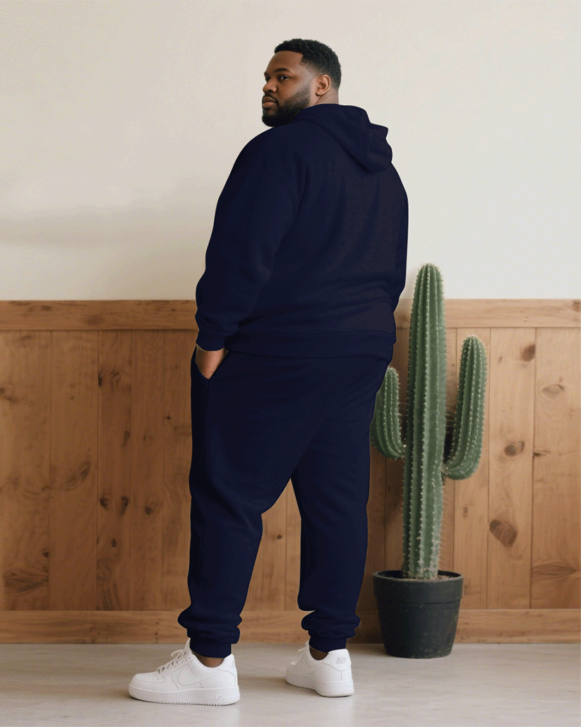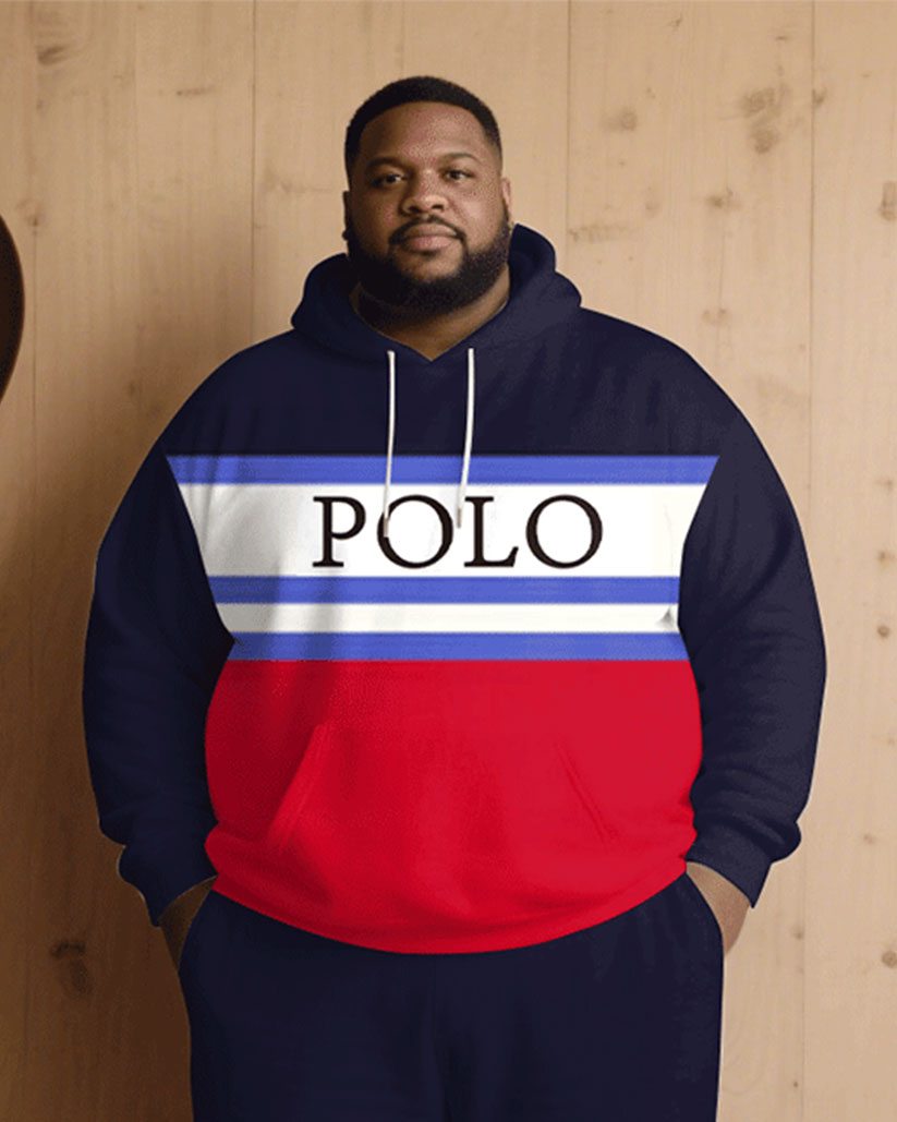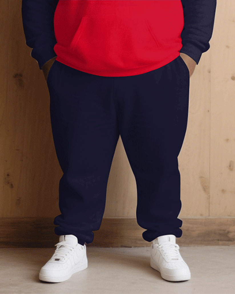Big & Tall Men Fall/Winter Dark Blue & Red & White Contrast Color Mosaic Letters Casual Printed Hoodie Suit