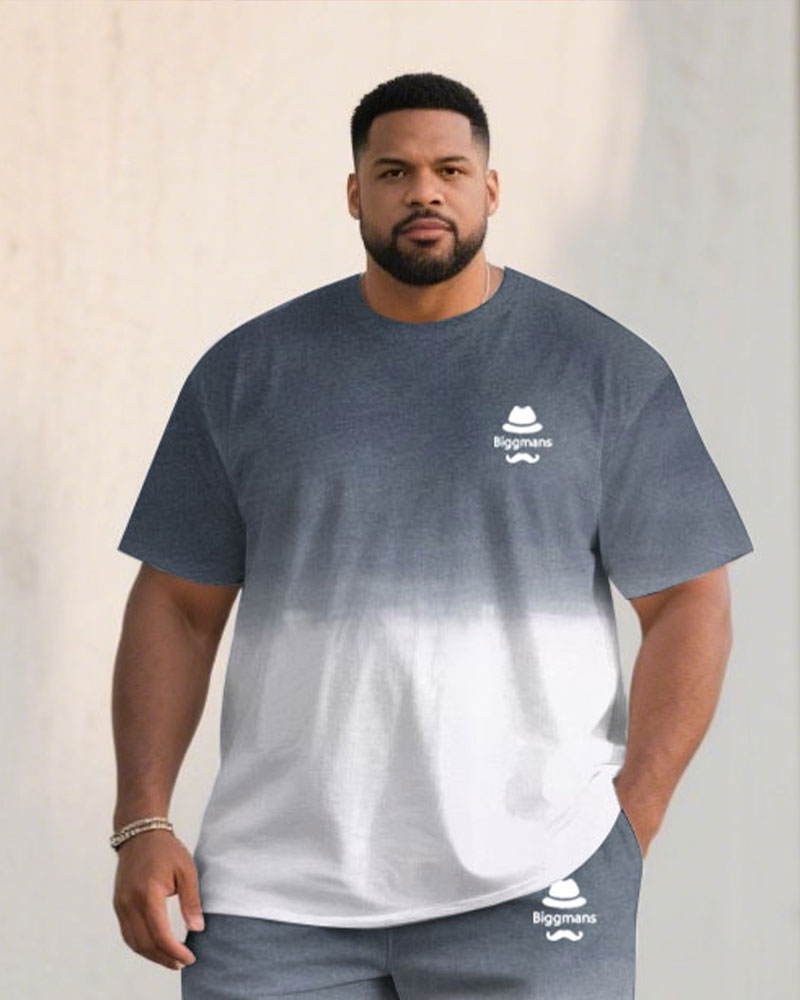 Big & Tall Men Fog Grey & White Gradient Contrast Color Chest Small Label Printing Crewneck Short Sleeve T-shirt Shorts Suit