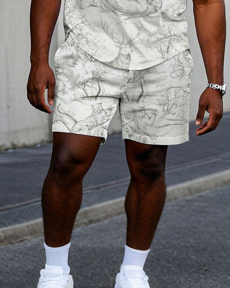 Big & Tall Men White Animal Forest Full Size Printed Loose Crewneck Short Sleeve T-Shirt Shorts Suit