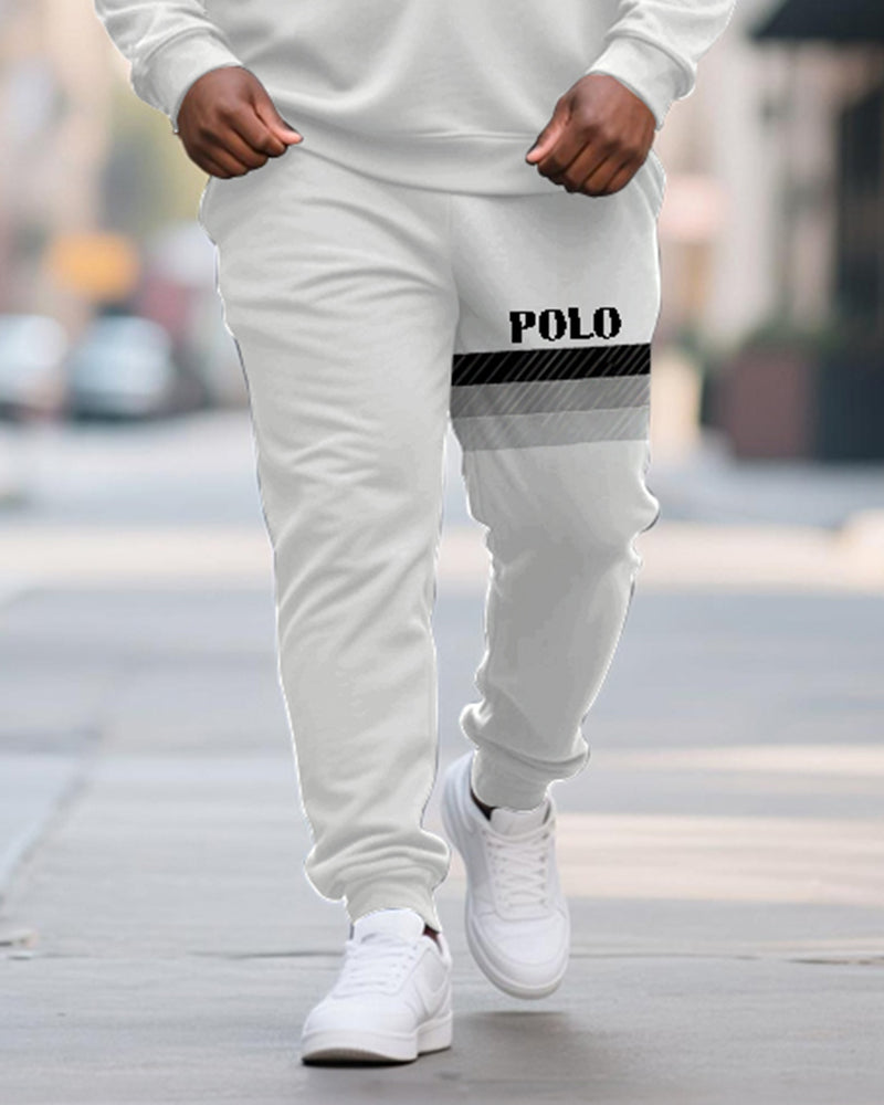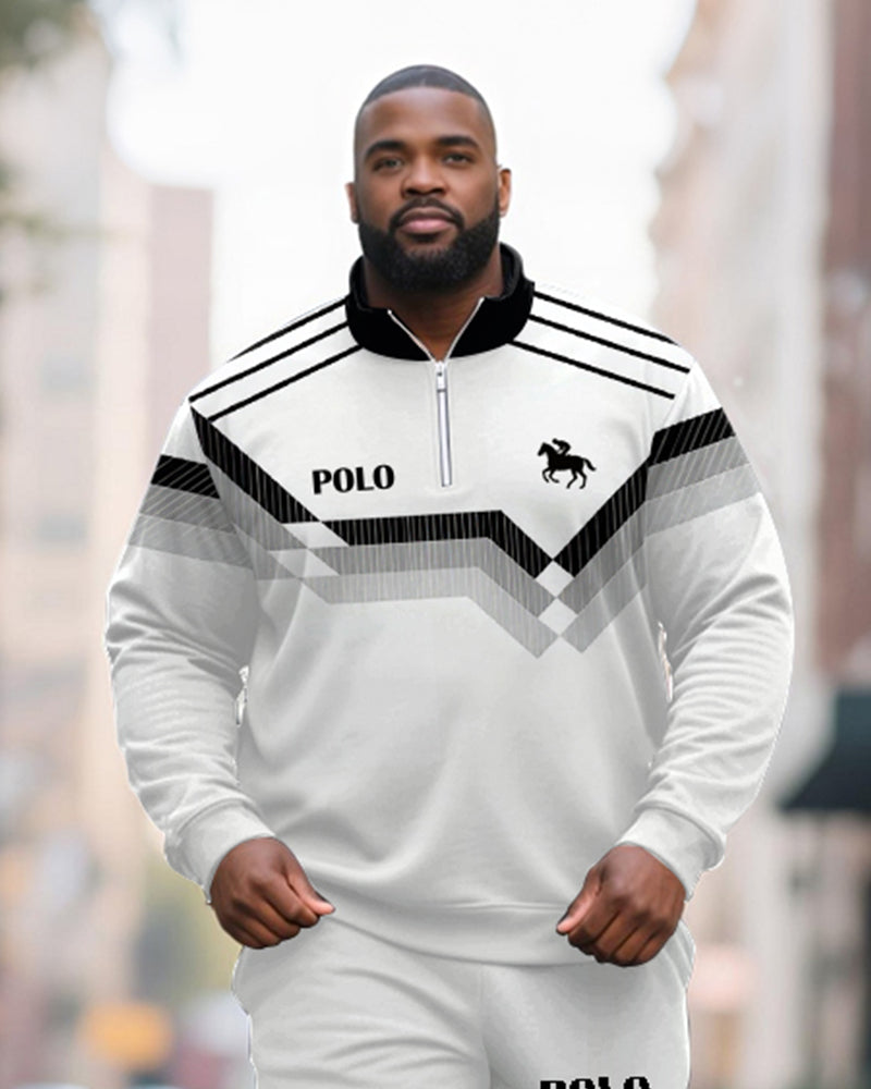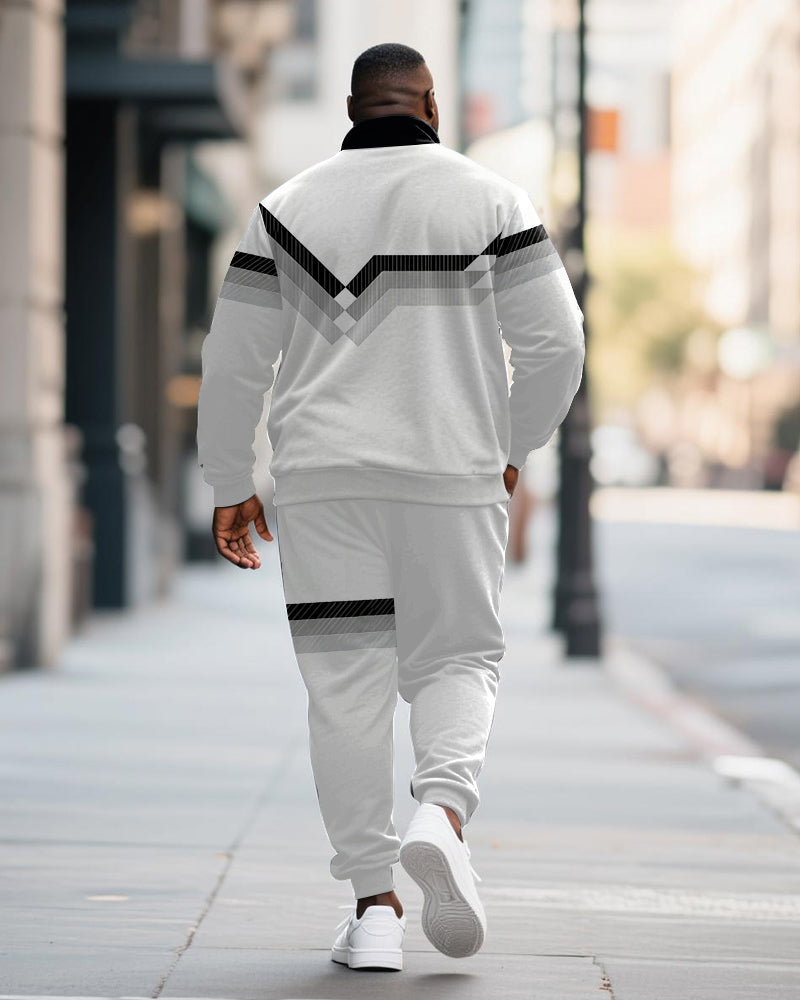 Big & Tall Men's Black And Gray Contrast Printed POLO Collar Zipper Long Sleeve Pants Two-piece Set