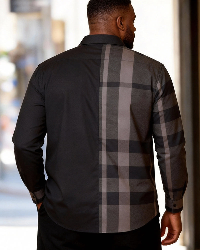 Big & Tall Men's Black And Gray Stitching Check Print Long Sleeve Shirt
