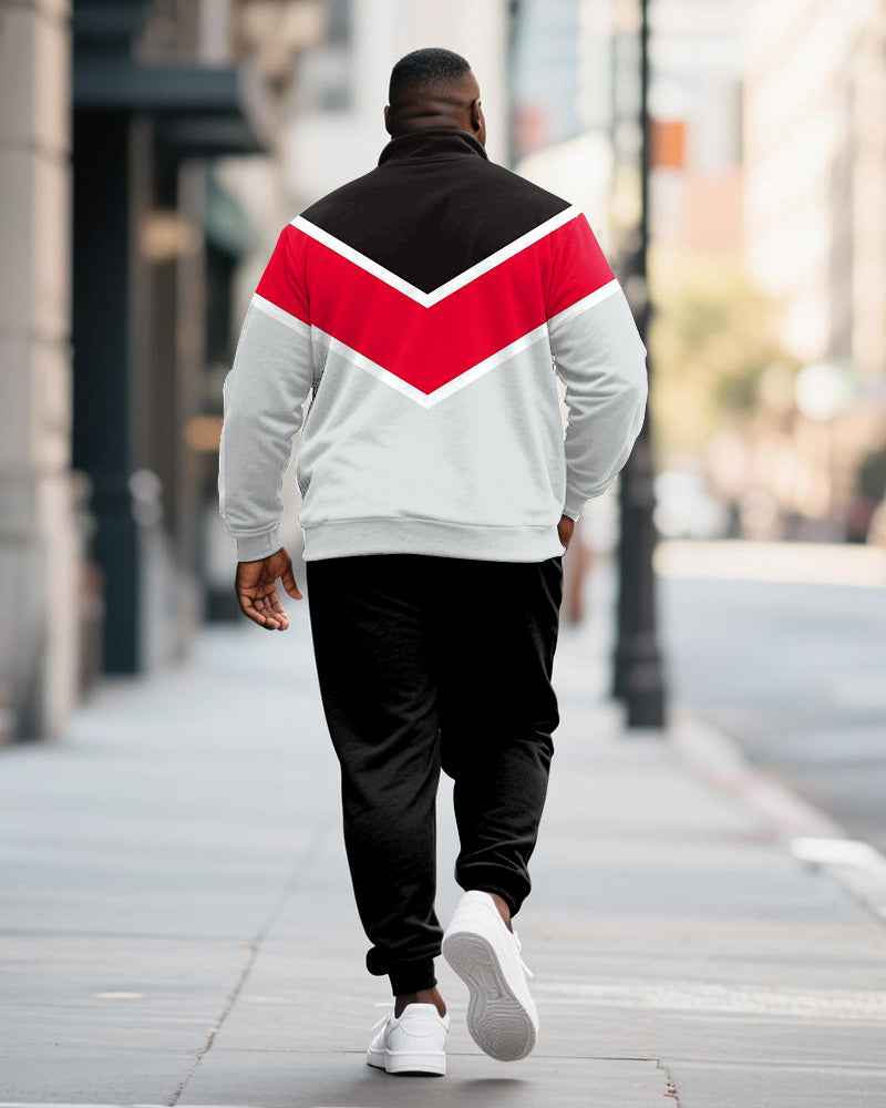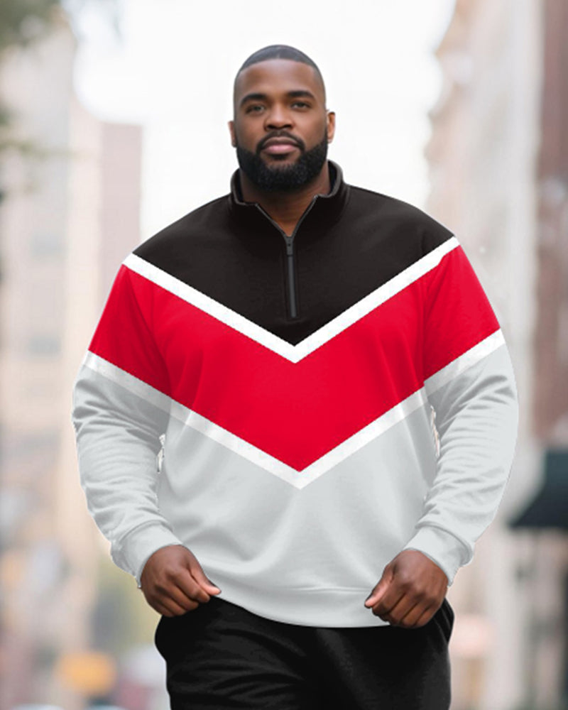 Big & Tall Men's Black And Red Striped Contrast Printed POLO Collar Zipper Long Sleeve Pants Two-piece Set
