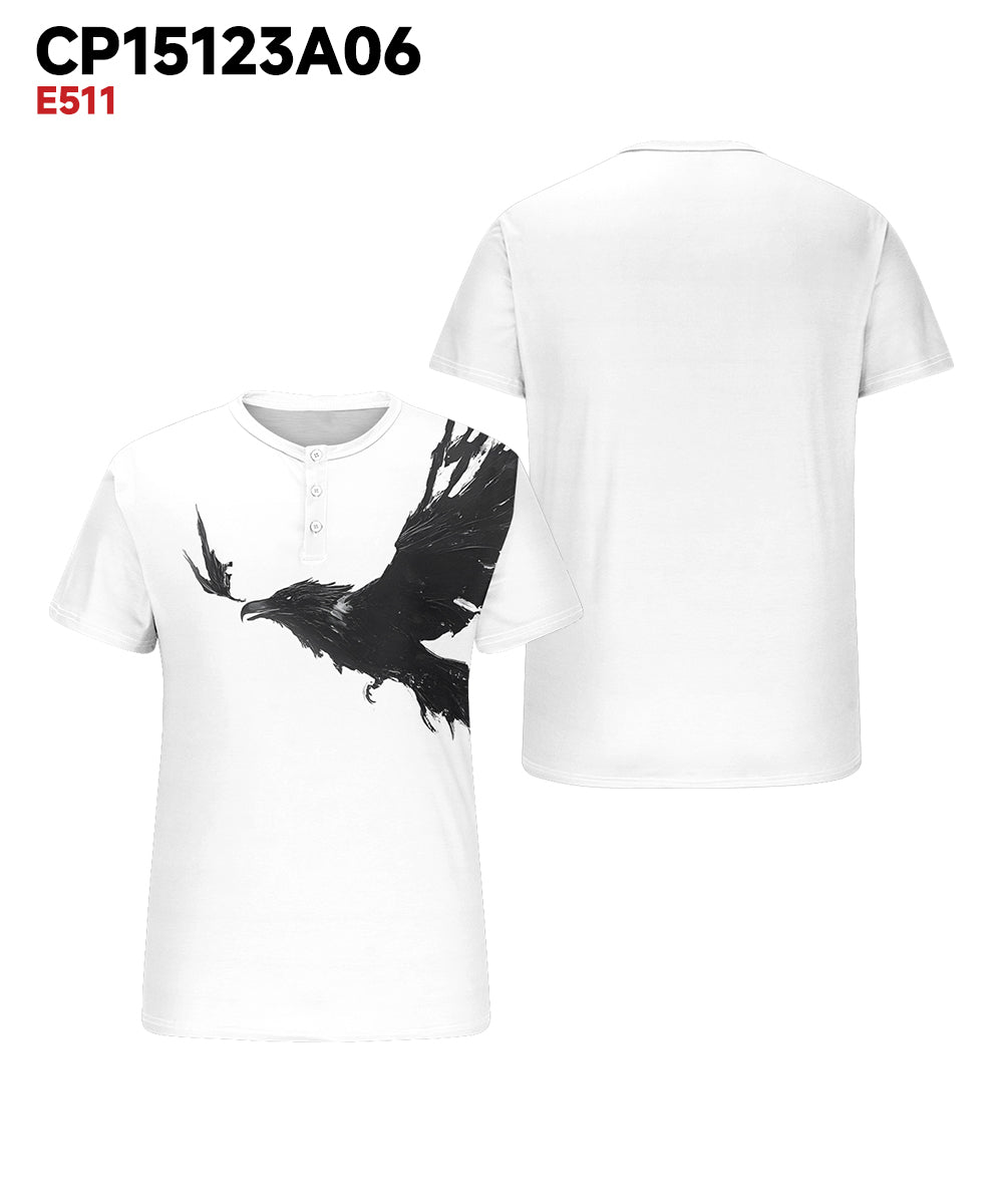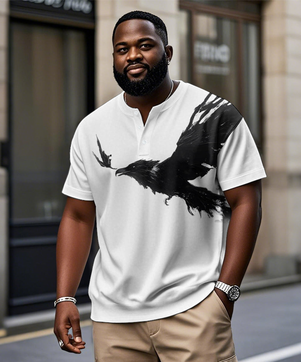 Big & Tall Men's Black And White Eagle Print Henry Collar Button Short Sleeve Tee