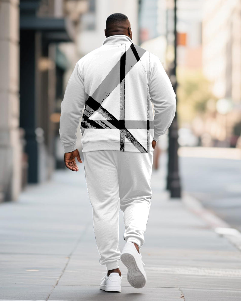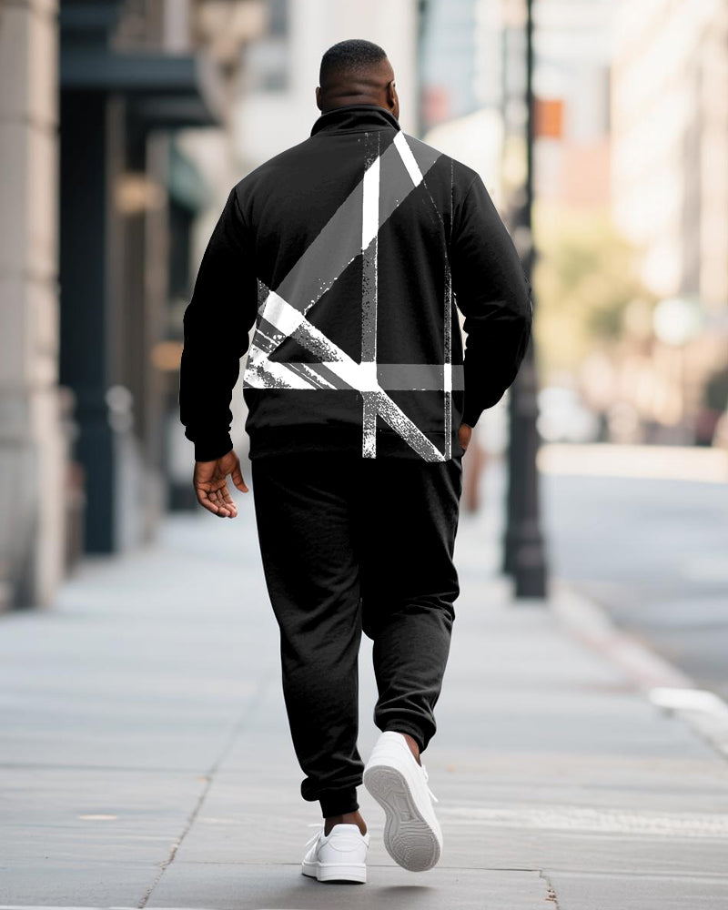 Big & Tall Men's Black And White Geometric Letter Printed POLO Collar Zipper Long Sleeve Pants Two-piece Set