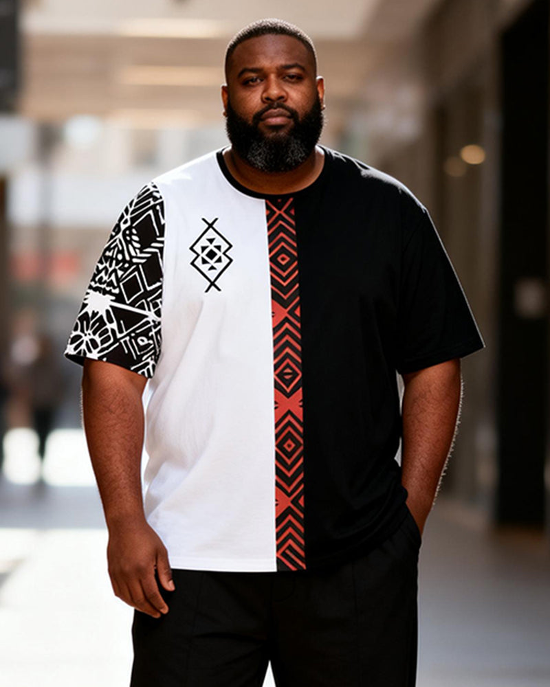 Big & Tall Men's Black And White Red Geometric Stitching Printed T-shirt Trousers Set