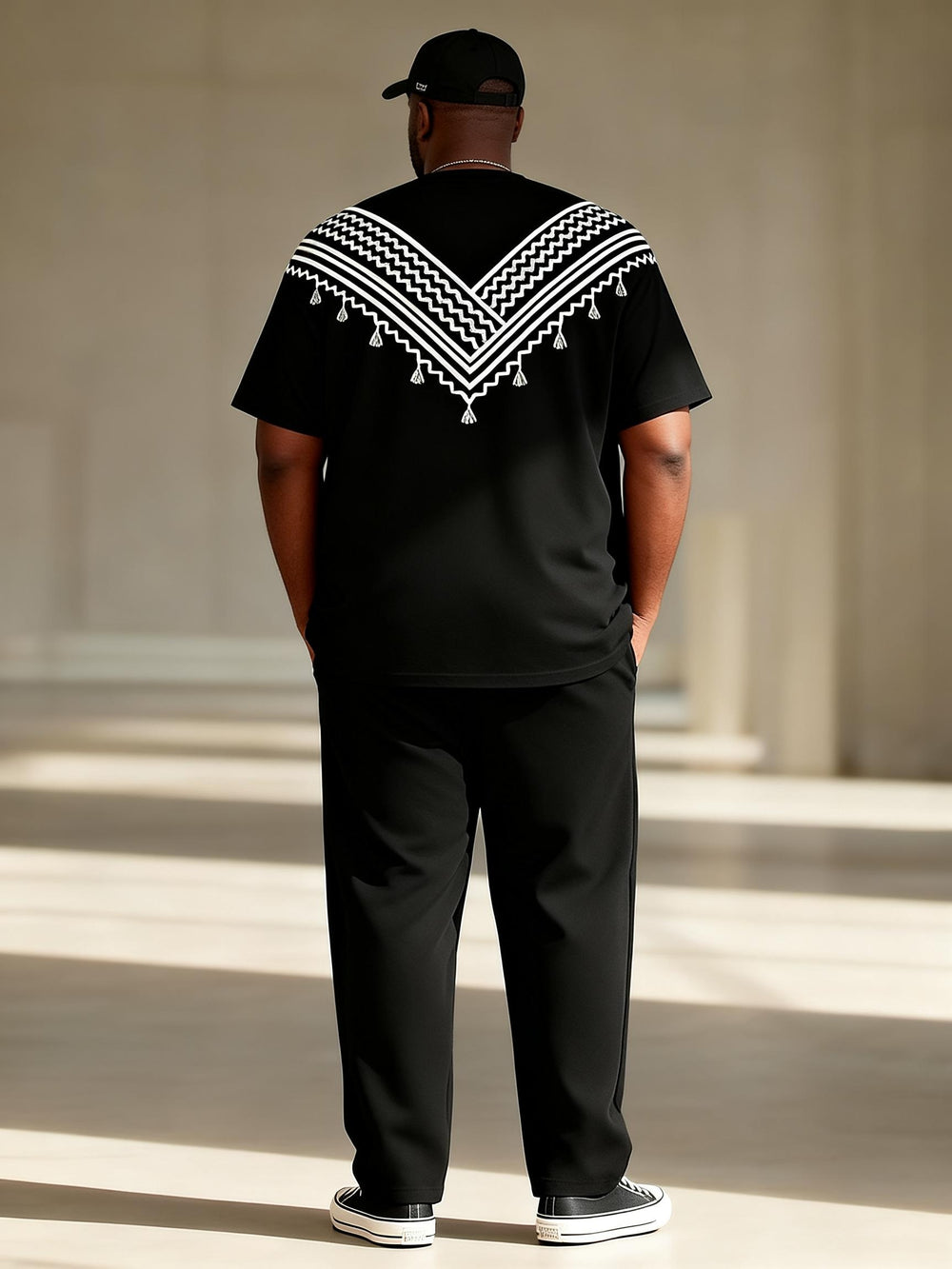 Big & Tall Men's Black And White V-shaped Tassel Ethnic Style Printed T-shirt Pants Set
