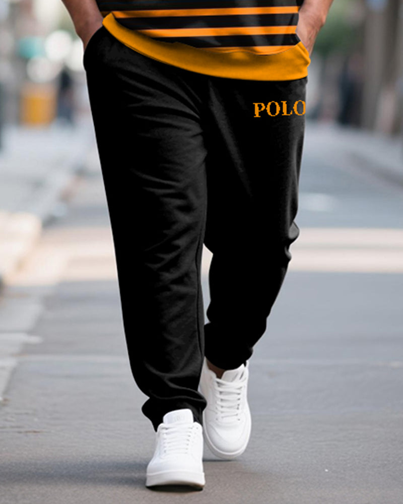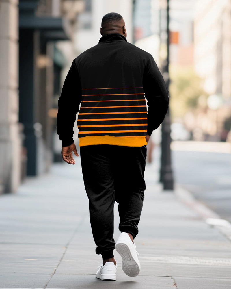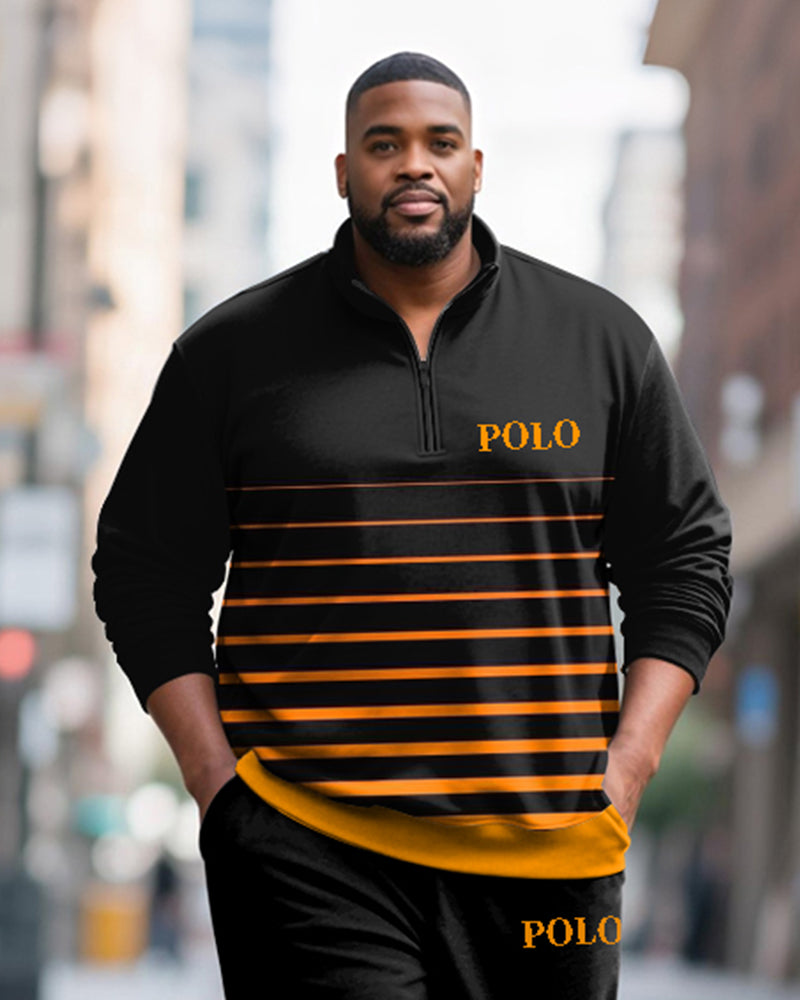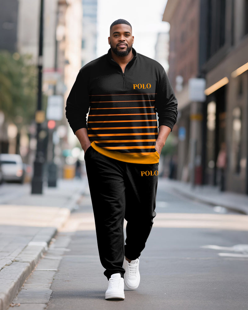 Big & Tall Men's Black And Yellow Striped Letter Printed POLO Collar Zipper Long Sleeve Pants Two-Piece Set