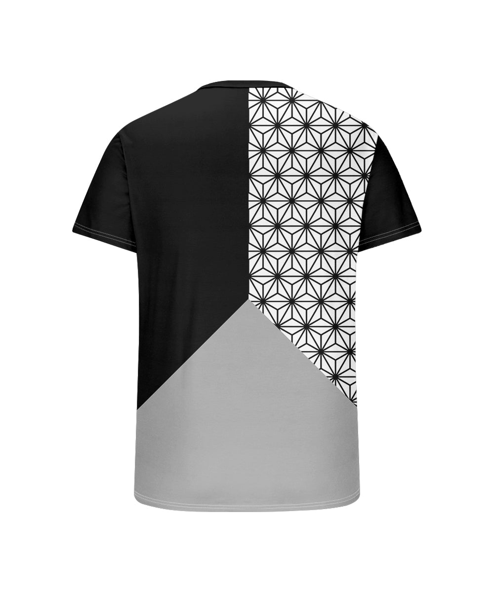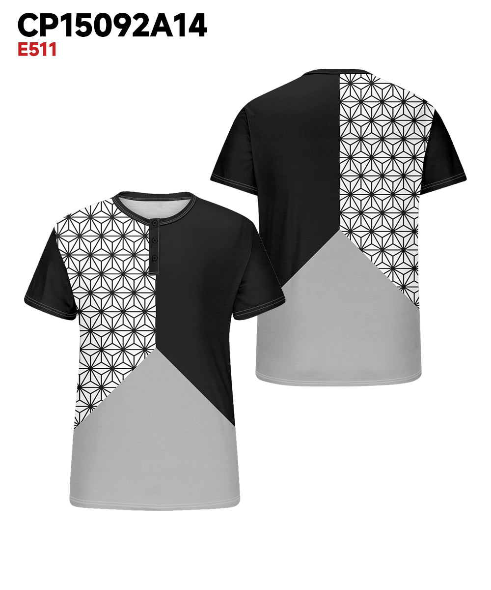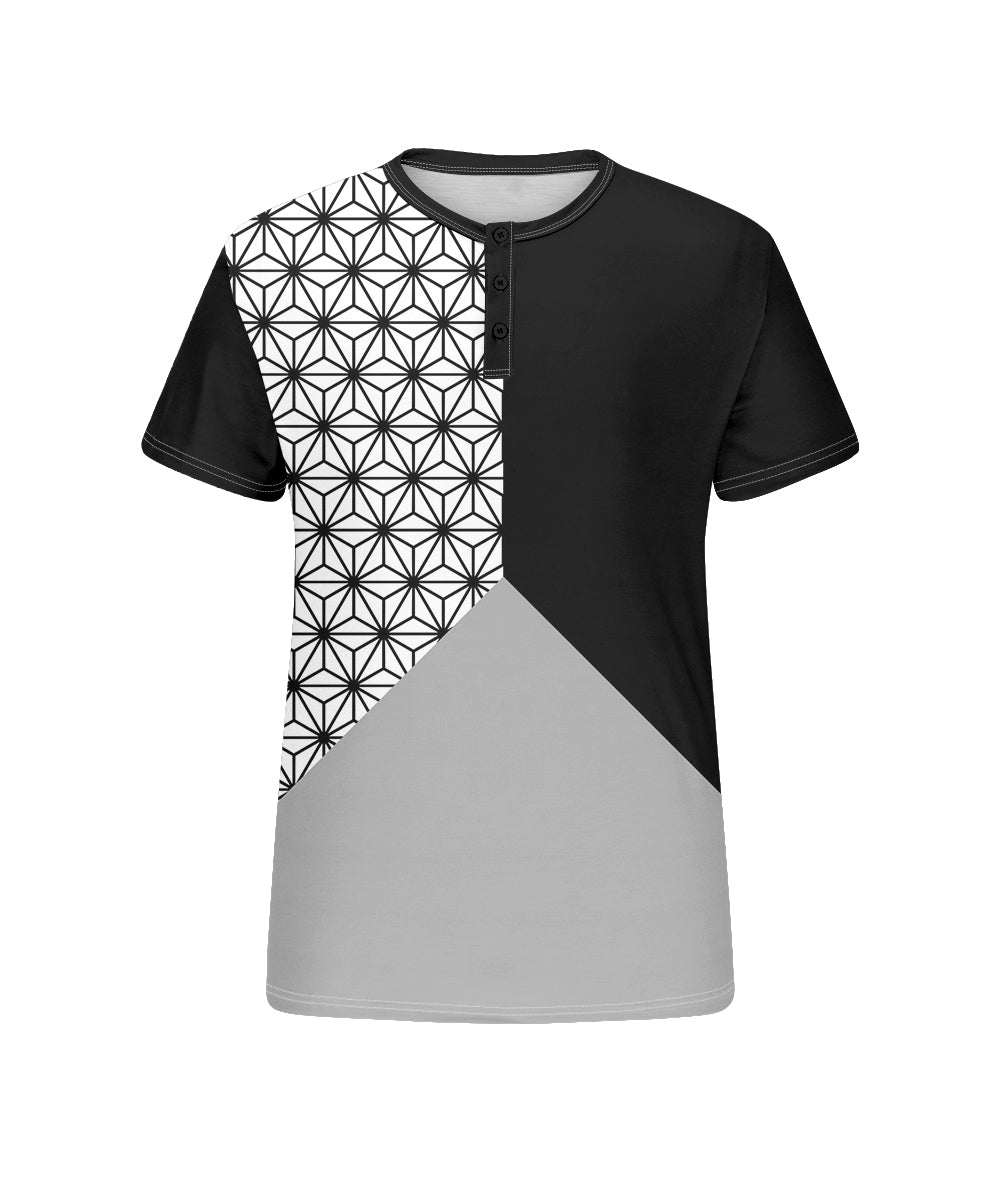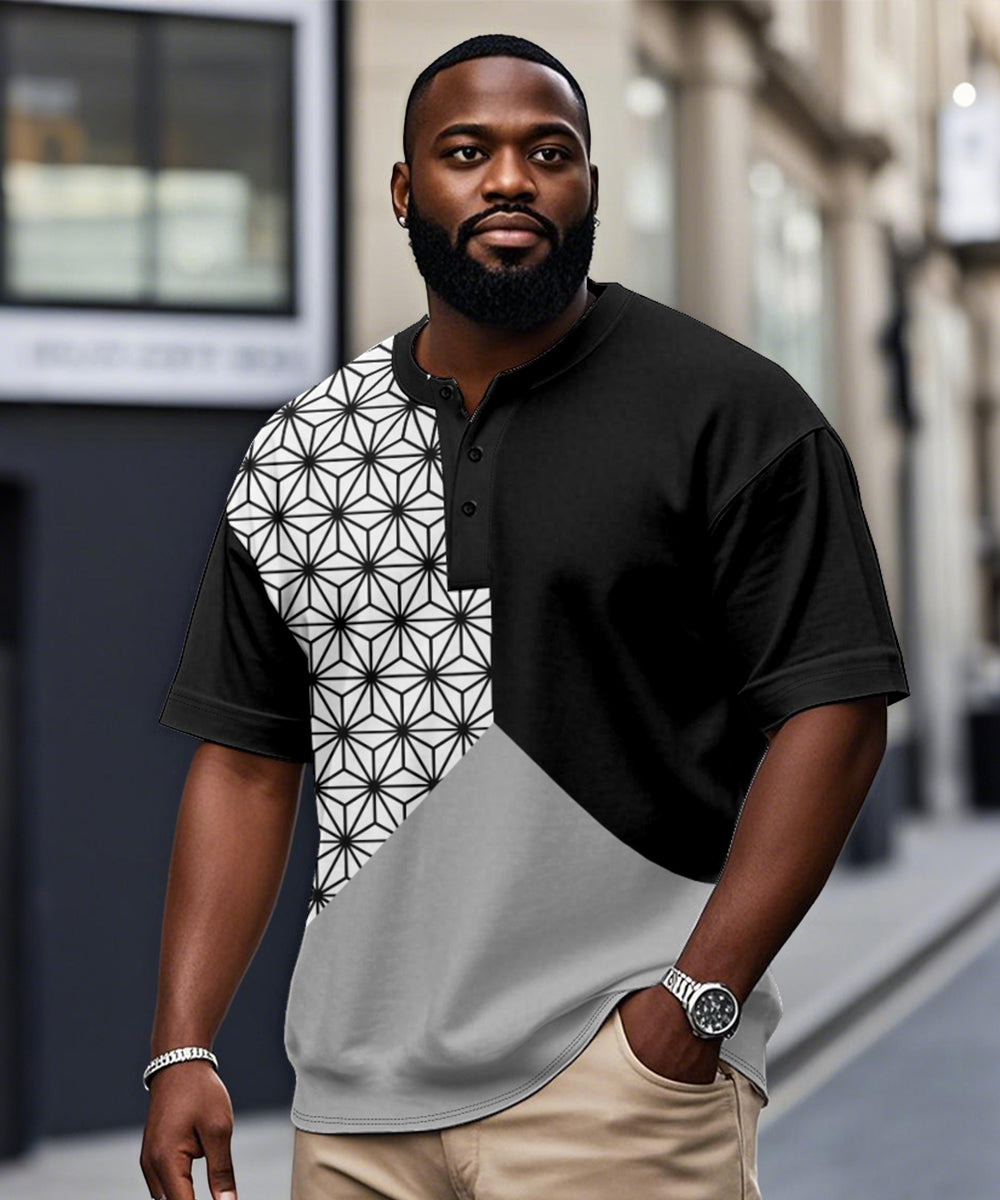 Big & Tall Men's Black Tricolor Geometric Printed Henry Collar Button Short Sleeve T-shirt