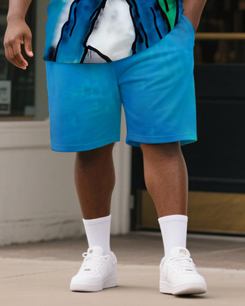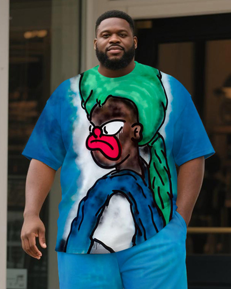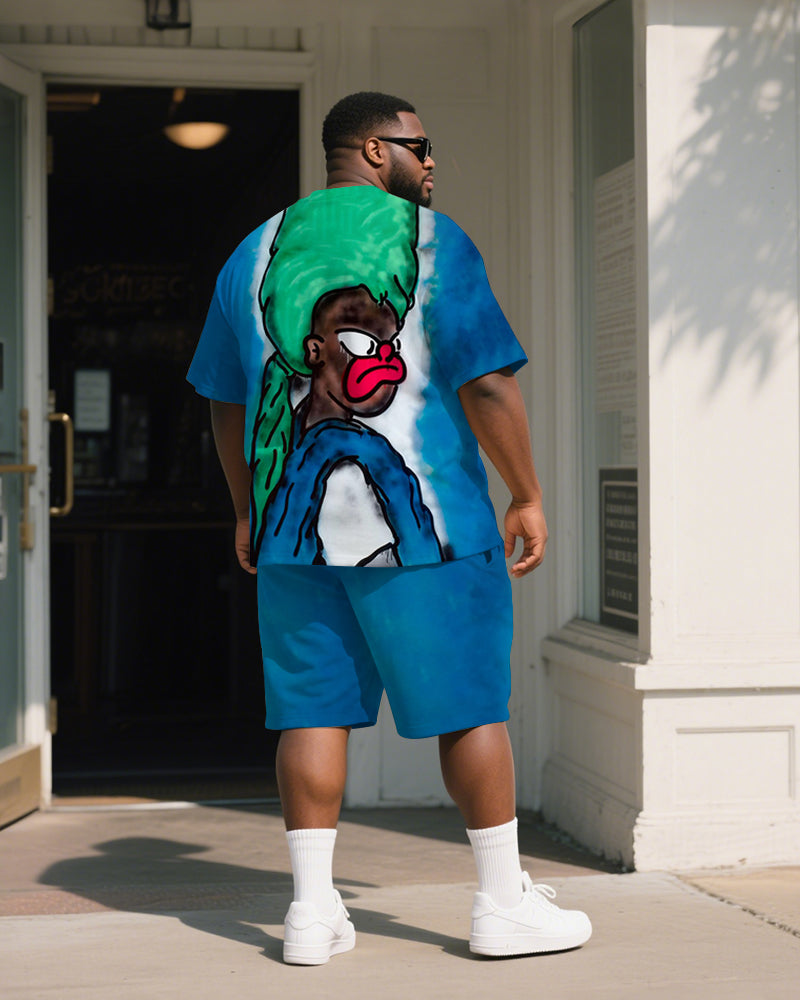 Big & Tall Men's Blue Cartoon Graffiti Print Round Neck Short Sleeve T-Shirt Shorts Suit