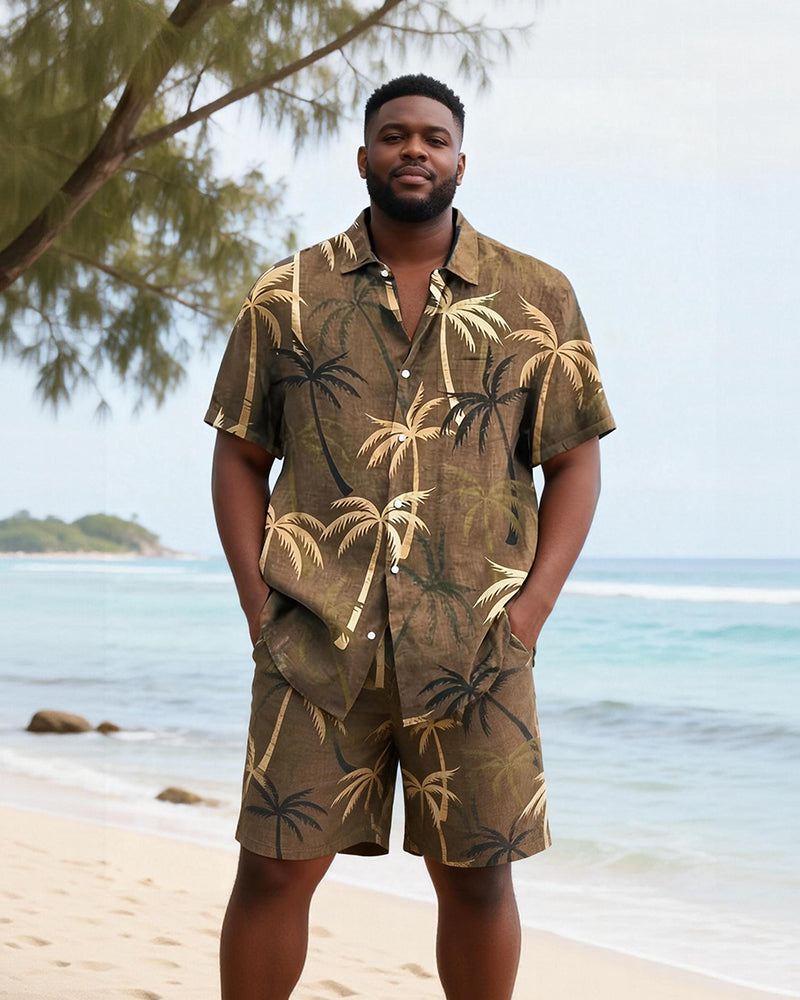 Big & Tall Men's Brown Coconut Retro Printed Short Sleeve Shirt Shorts Set