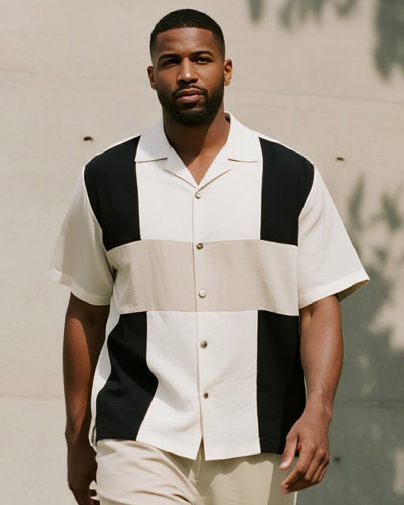 Big & Tall Men's Business Apricot Color Matching Geometric Print Short Sleeve Shirt Trousers Suit