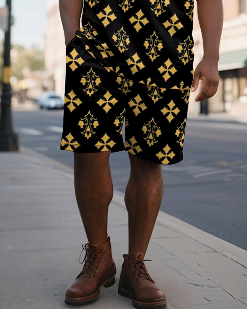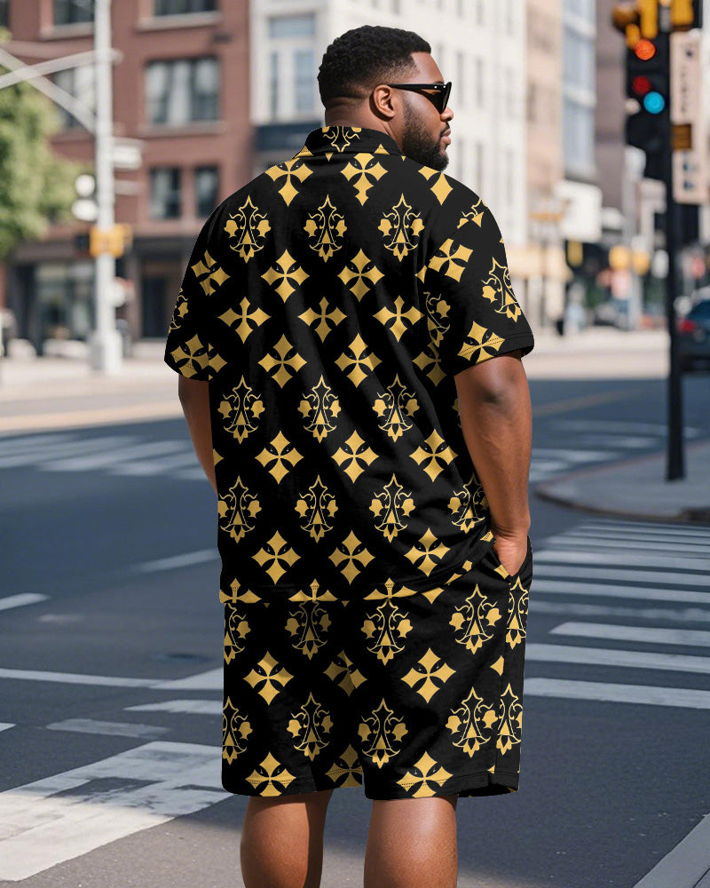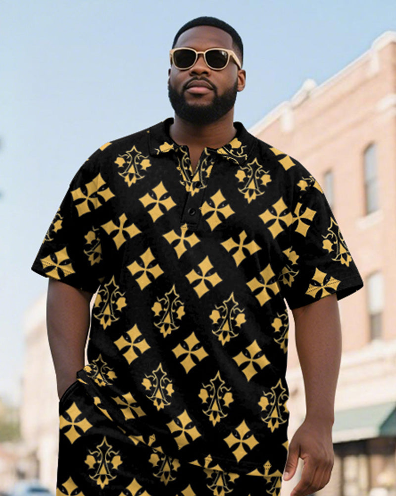 Big & Tall Men's Business Black And Yellow Color Block Diamond Printed Short Sleeve Polo Shirt Shorts Suit