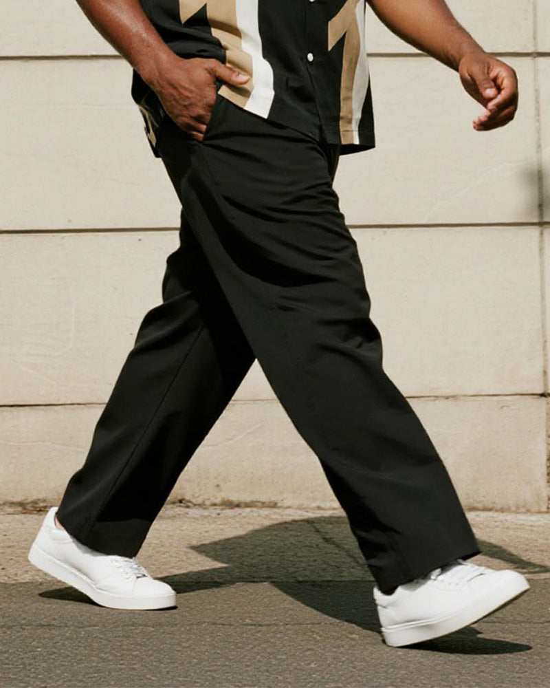 Big & Tall Men's Business Black Color Matching Khaki Geometric Print Short Sleeve Shirt Trousers Suit
