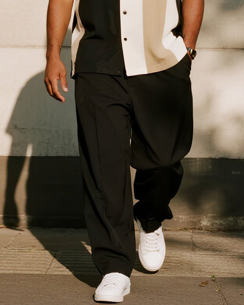 Big & Tall Men's Business Black Colorblock Stripe Printed Pocket Short Sleeve Shirt Trousers Suit