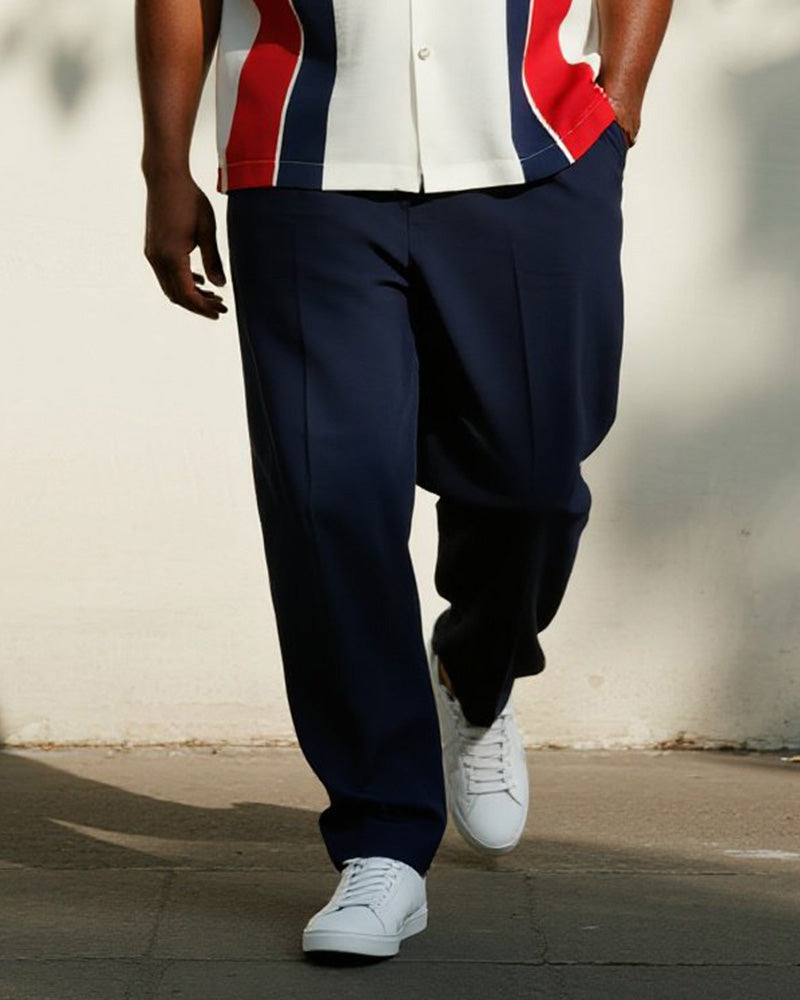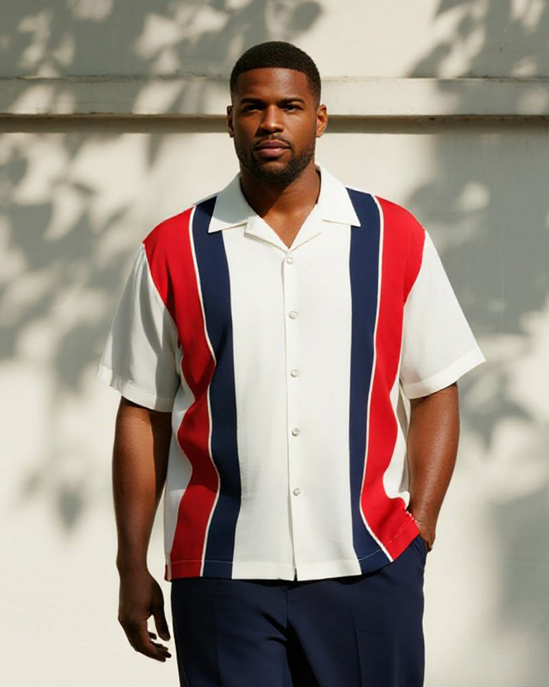 Big & Tall Men's Business Blue And Red Striped Print Short Sleeve Shirt Trousers Suit
