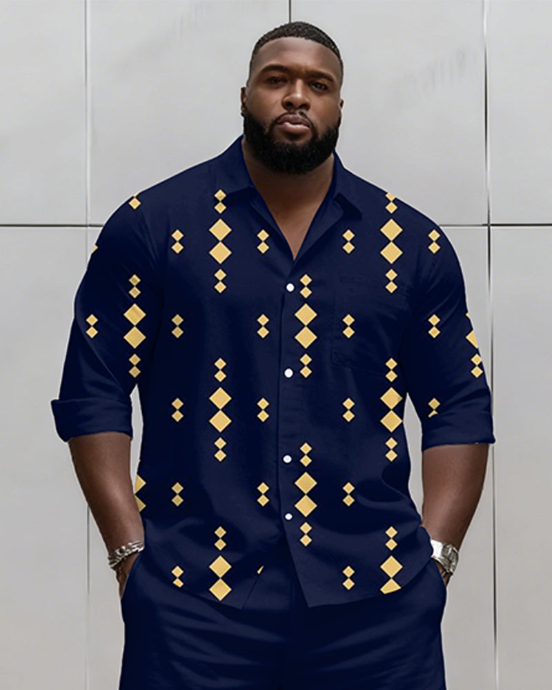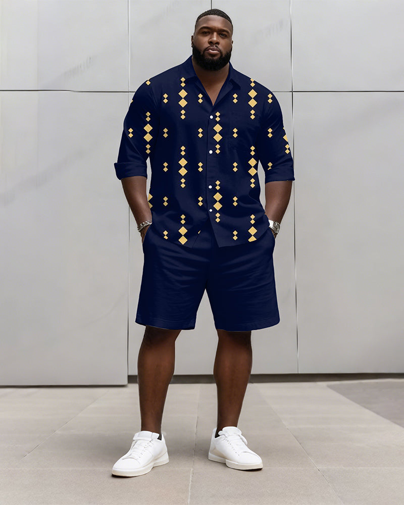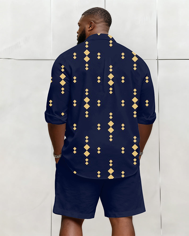 Big & Tall Men's Business Blue Geometric Print Long Sleeve Shirt Shorts Set