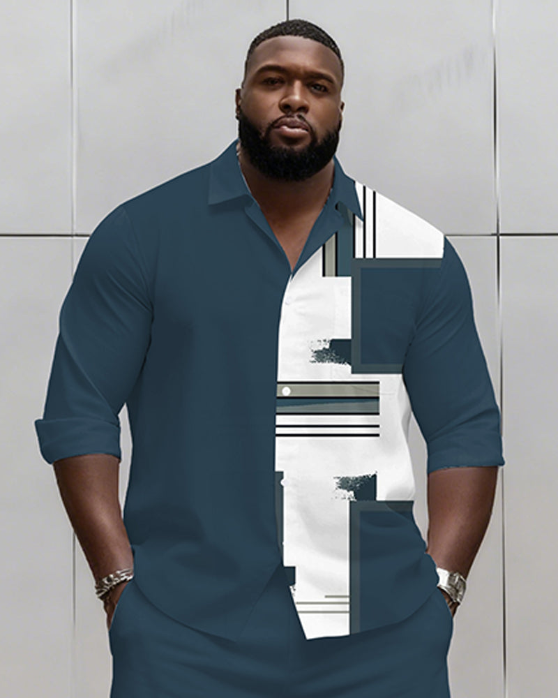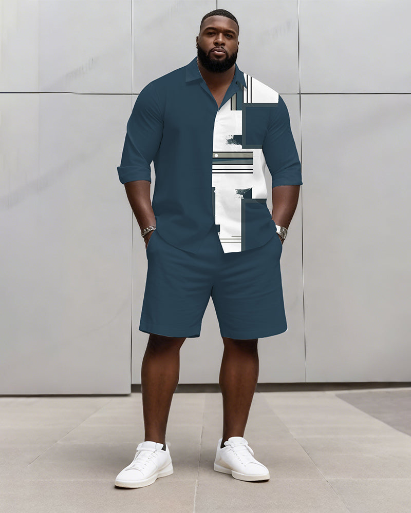 Big & Tall Men's Business Blue Geometric Print Long Sleeve Shirt Shorts Set