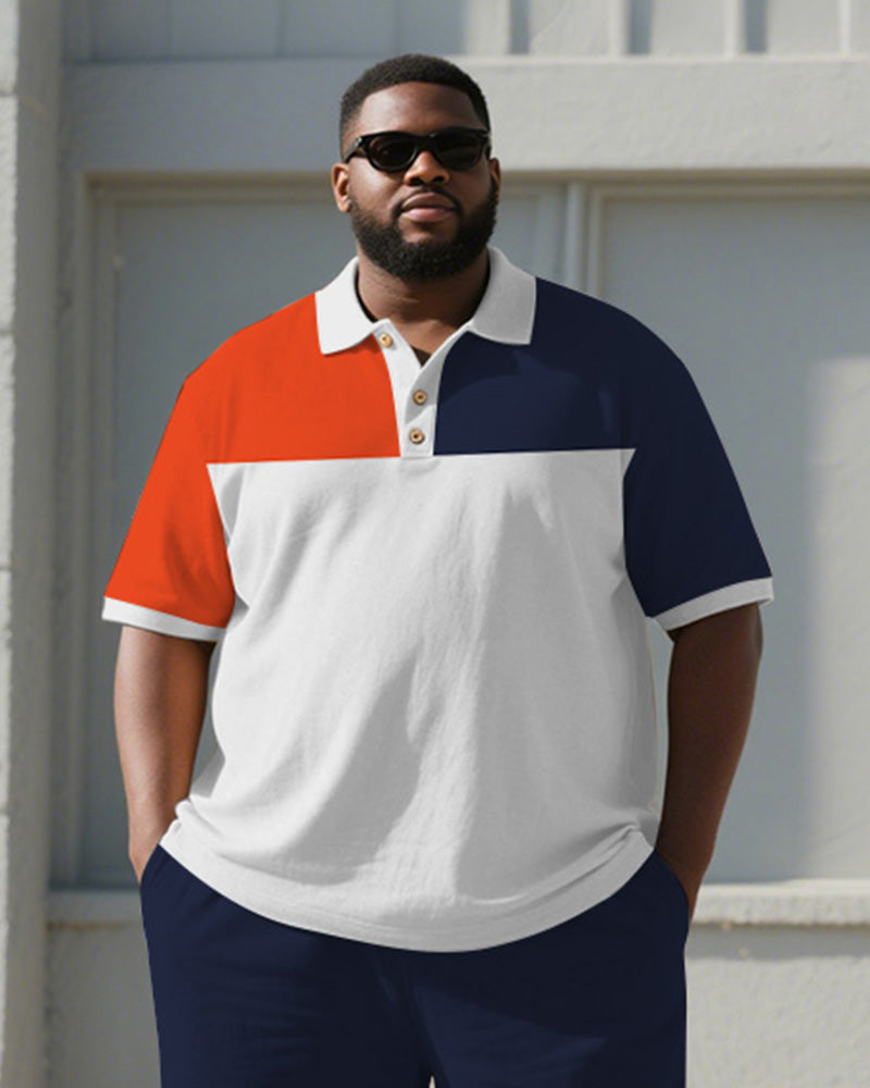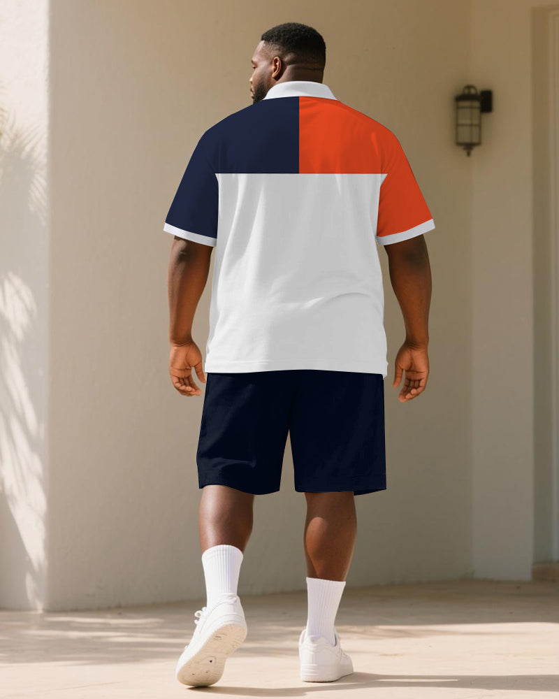 Big & Tall Men's Business Blue Orange Geometric Colorblock Print Short Sleeve Polo Shirt Shorts Suit