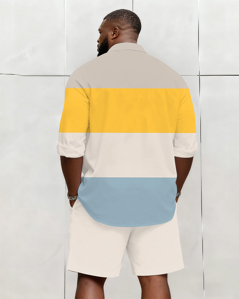 Big & Tall Men's Business Blue Yellow Beige Color Matching Printed Long Sleeve Shirt Shorts Set