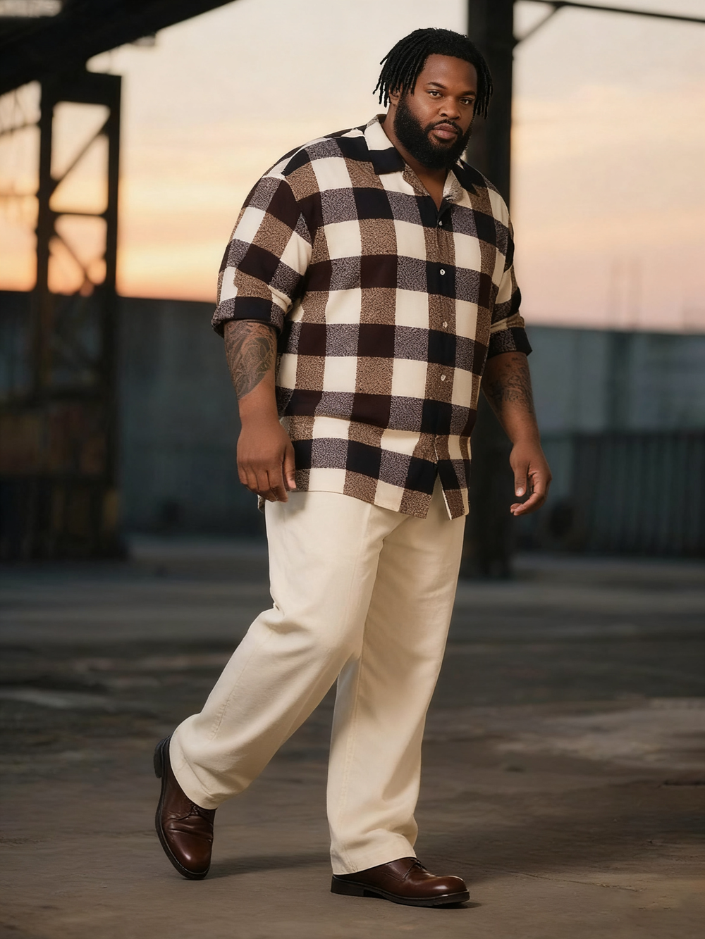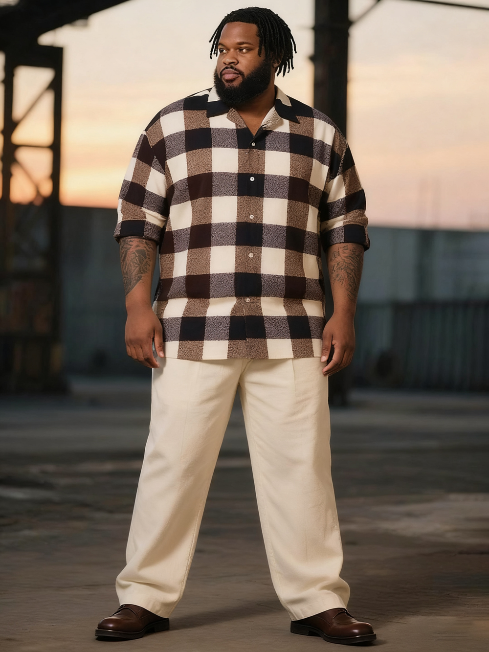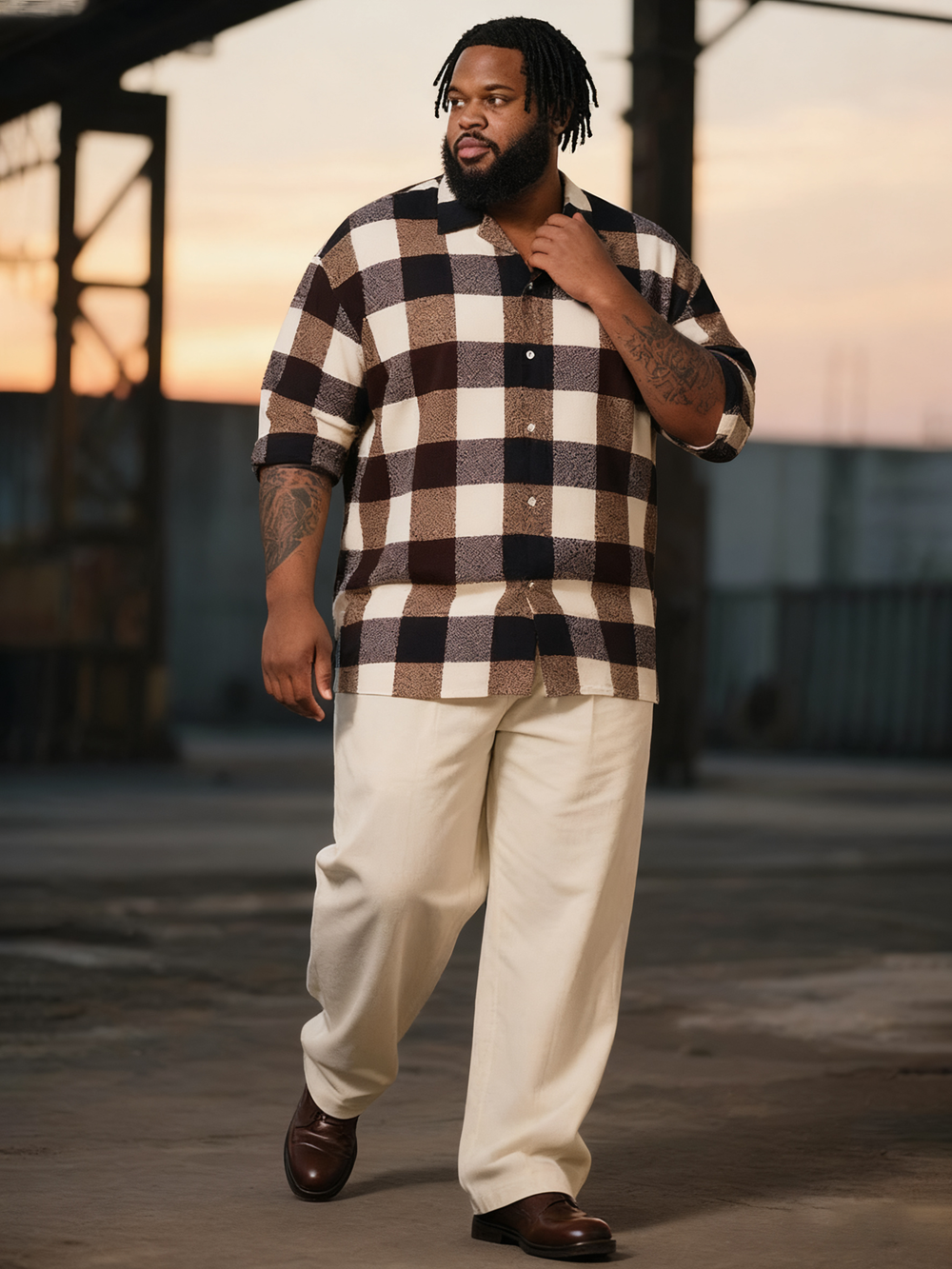 Big & Tall Men's Business Brown Plaid Print Long Sleeve Shirt Trousers Suit