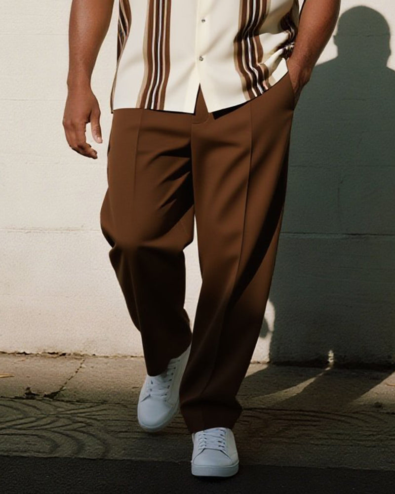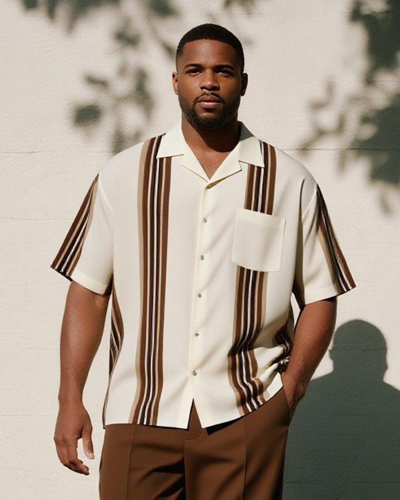Big & Tall Men's Business Brown Striped Print Pocket Short Sleeve Shirt Trousers Suit