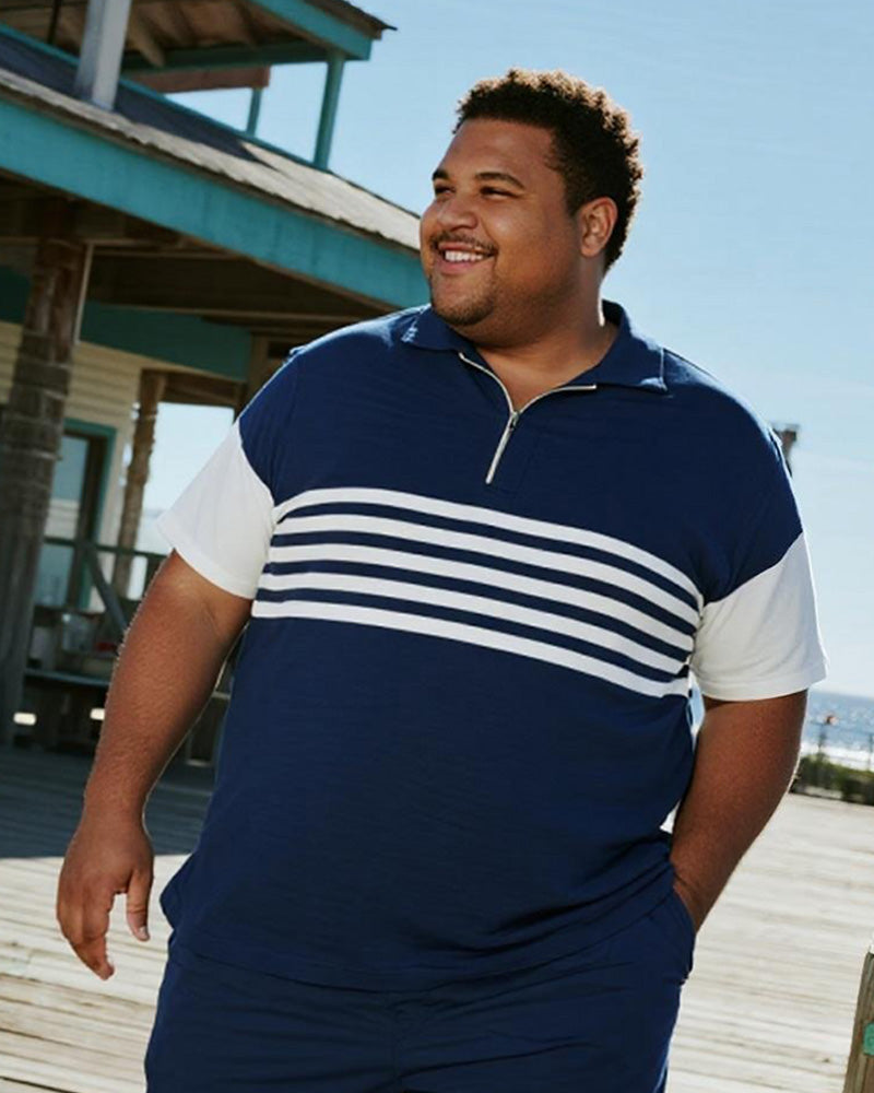 Big & Tall Men's Business Dark Blue Striped Print Short Sleeve Zip Polo Shirt Shorts Suit