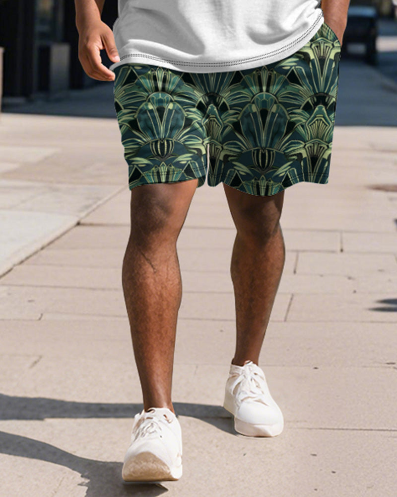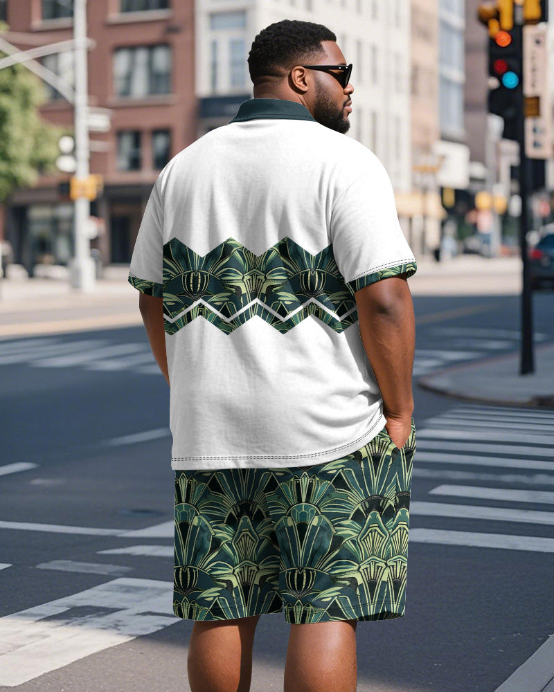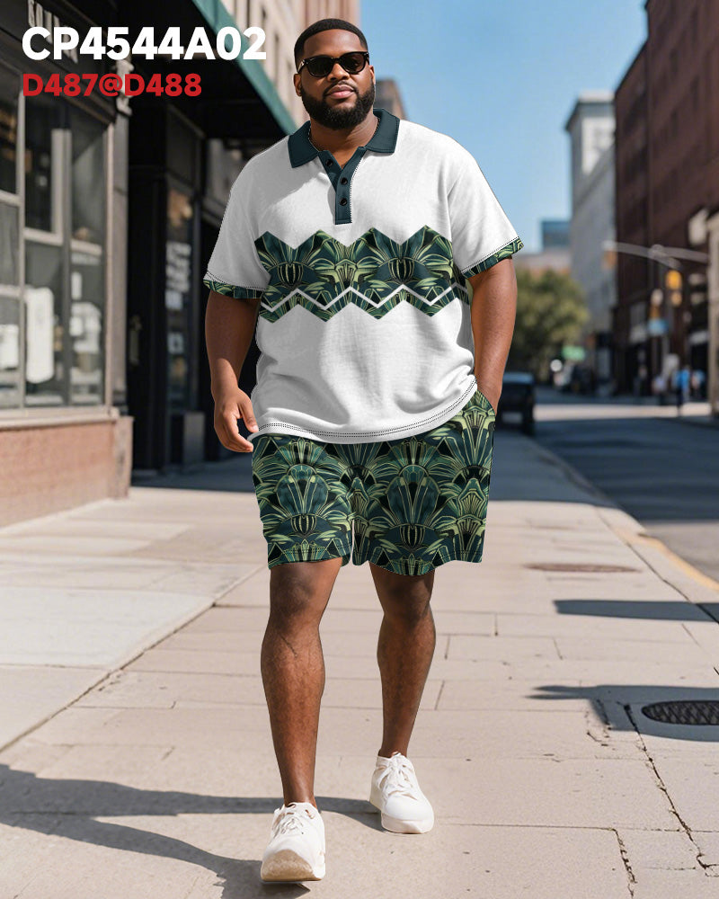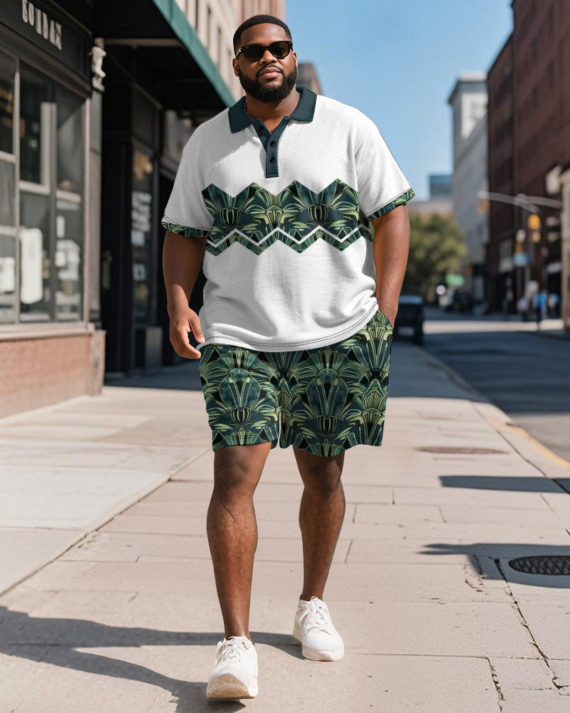 Big & Tall Men's Business Green Colorblock Geometric Print Short Sleeve Polo Shirt Shorts Suit