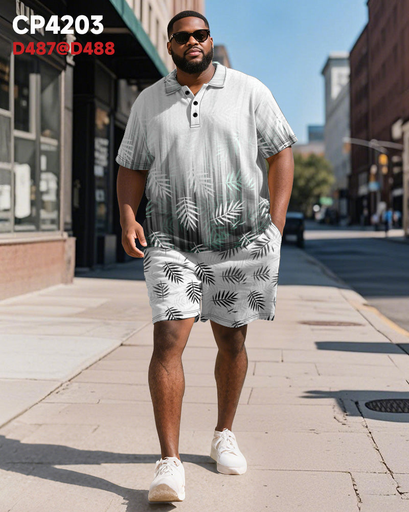 Big & Tall Men's Business Hawaiian Gradient Leaf Print Short Sleeve Polo Shirt Shorts Suit
