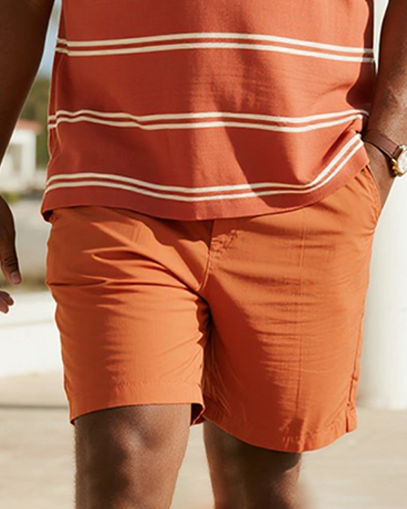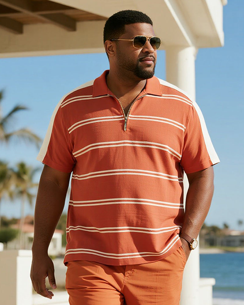 Big & Tall Men's Business Orange Stripe Print Short Sleeve Zip Polo Shirt Shorts Suit